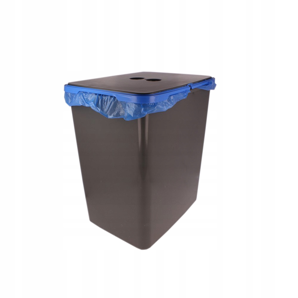 Удобный контейнер для повседневного использования, имеет синие ручки, которые также используются для хранения мешка для мусора.