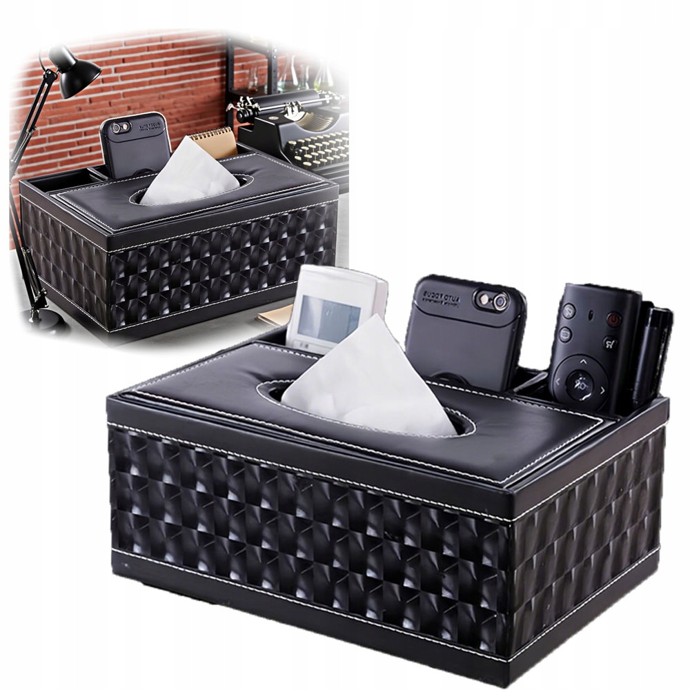 КОНТЕЙНЕР ДЛЯ САЛФЕТОК С 3 ОТДЕЛЕНИЯМИ ДЛЯ ДИСТАНЦИОННОГО УПРАВЛЕНИЯ, ТЕЛЕФОНА, ЧЕРНАЯ КОЖА