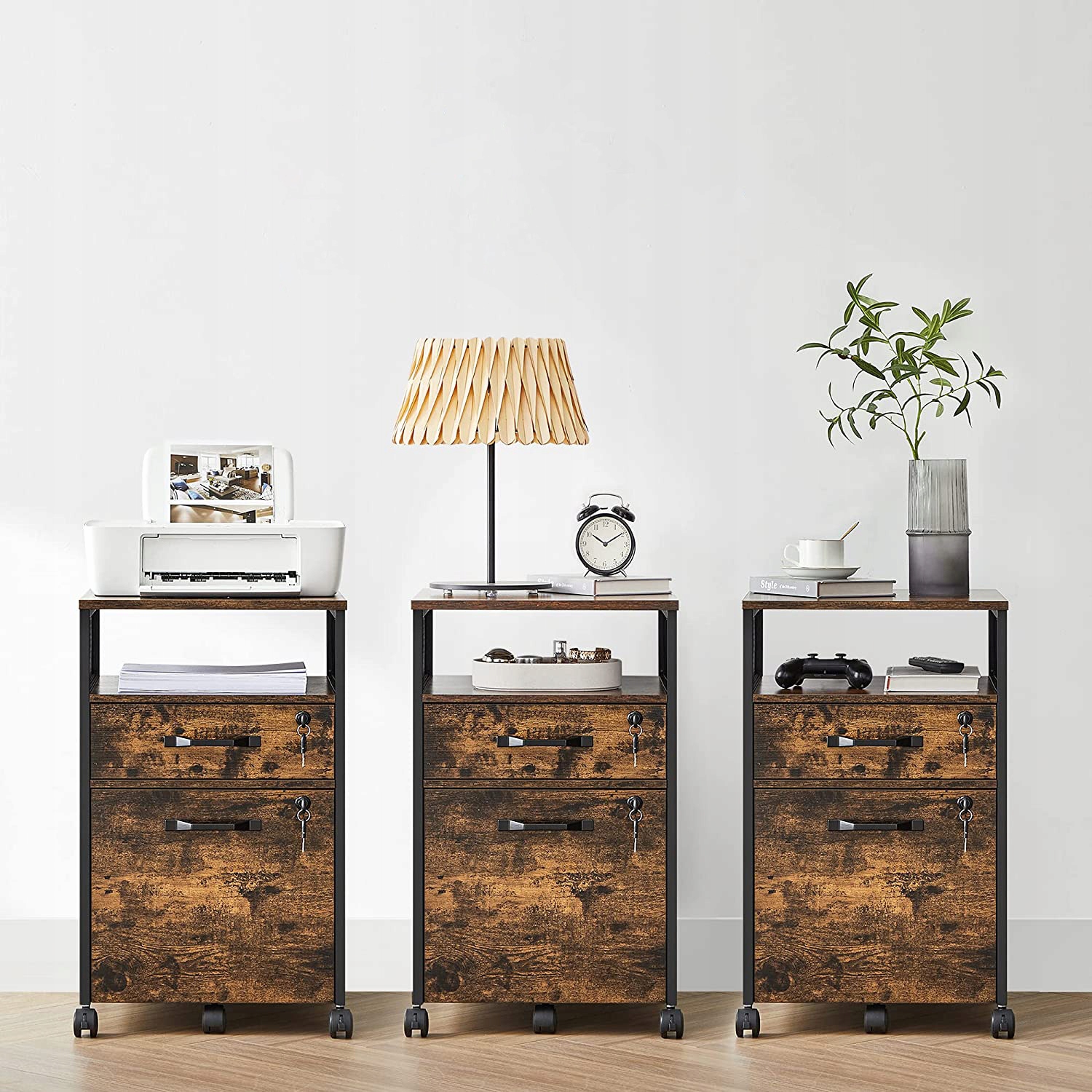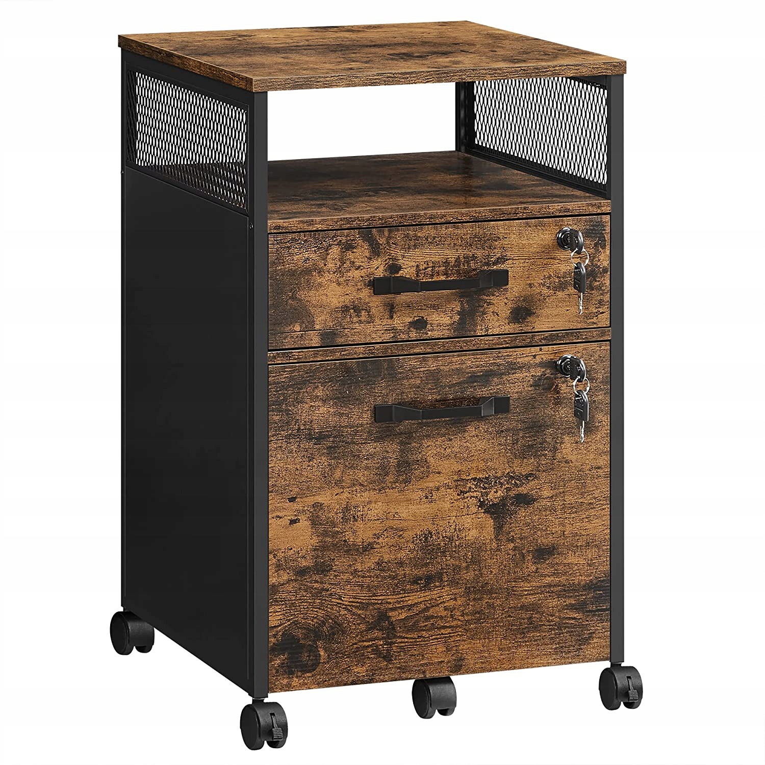Передвижной шкаф для документов из массива МДФ коричневого цвета. Он прекрасно украсит офис и любую комнату в стиле индустриальный, лофт или винтаж. Его можно использовать как прикроватную тумбочку или помощника на кухне. Контейнер оснащен четырьмя поворотными колесами на 360°. 2 из них можно зафиксировать, благодаря чему контейнер на колесах можно идеально адаптировать к различным ситуациям и помещениям. Полка и два выдвижных ящика разного размера позволяют удобно хранить все необходимые вещи под рукой. Дополнительным преимуществом является то, что оба ящика запираются независимо друг от друга. Максимальная статическая нагрузка: 60 кг