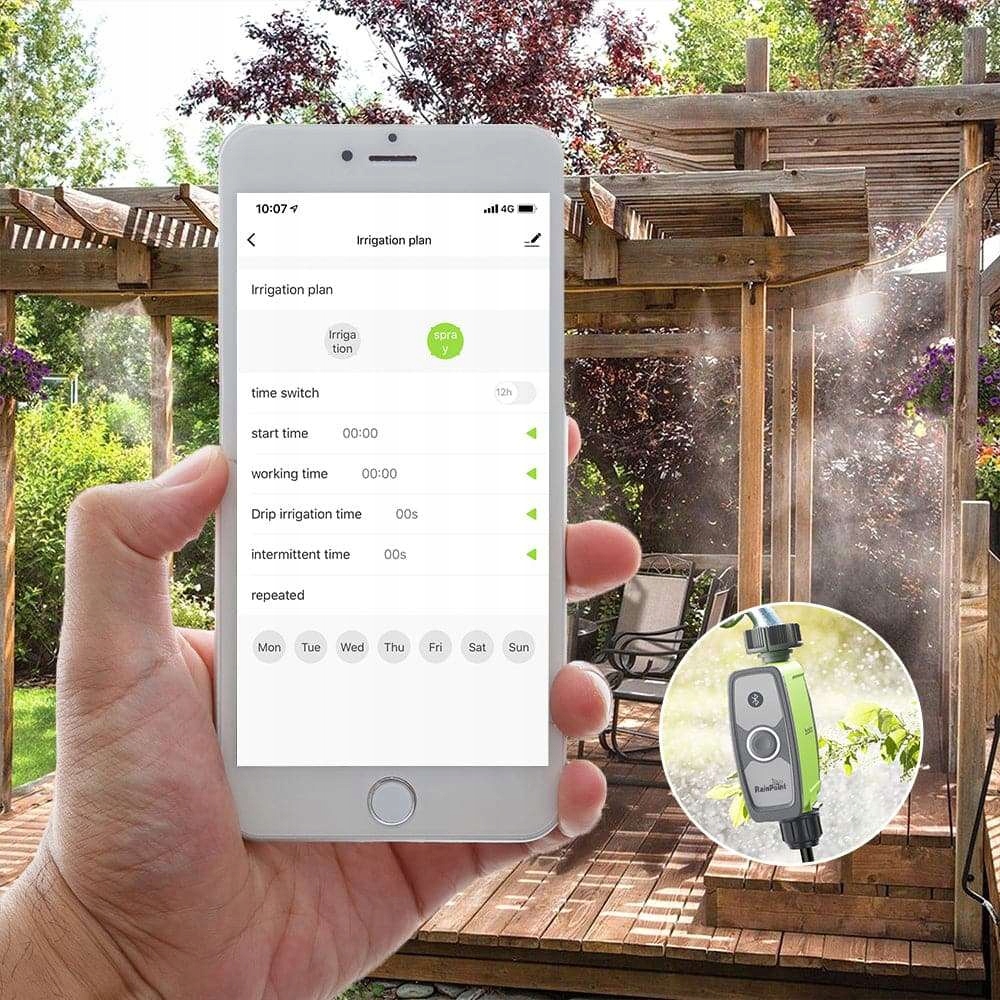 Простая установка и удобное управление:Установите приложение RaiPoint на телефон, подключитесь по Bluetooth к контроллеру. Введите настройки орошения.