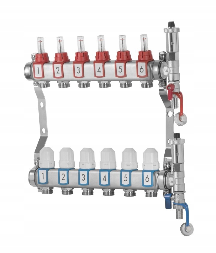 Комплект коллекторов из нержавеющей стали для подогрева полов в зданиях. В комплекте: монтажные соединители, вентиляционные клапаны центрального отопления. DN15-P, шаровые краны для слива центрального отопления ДН-15П, клапаны термостатические без головки Ду15-К, указатели расхода 0,5-5л/мин, кронштейны крепления.