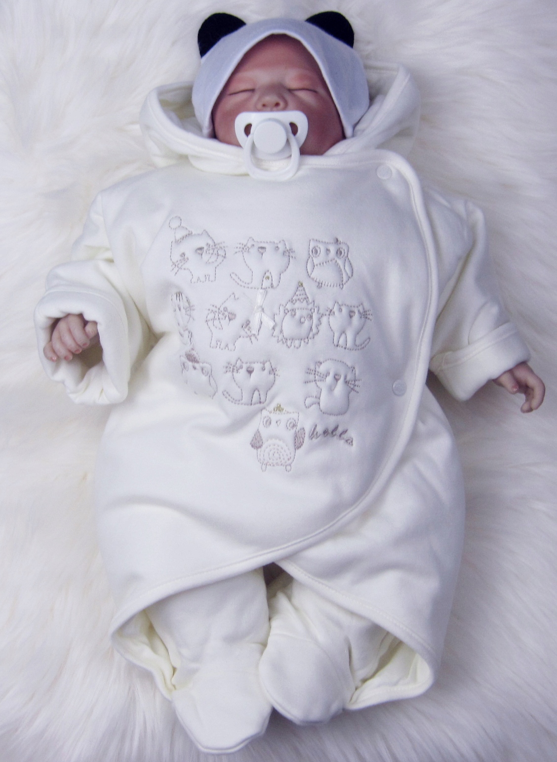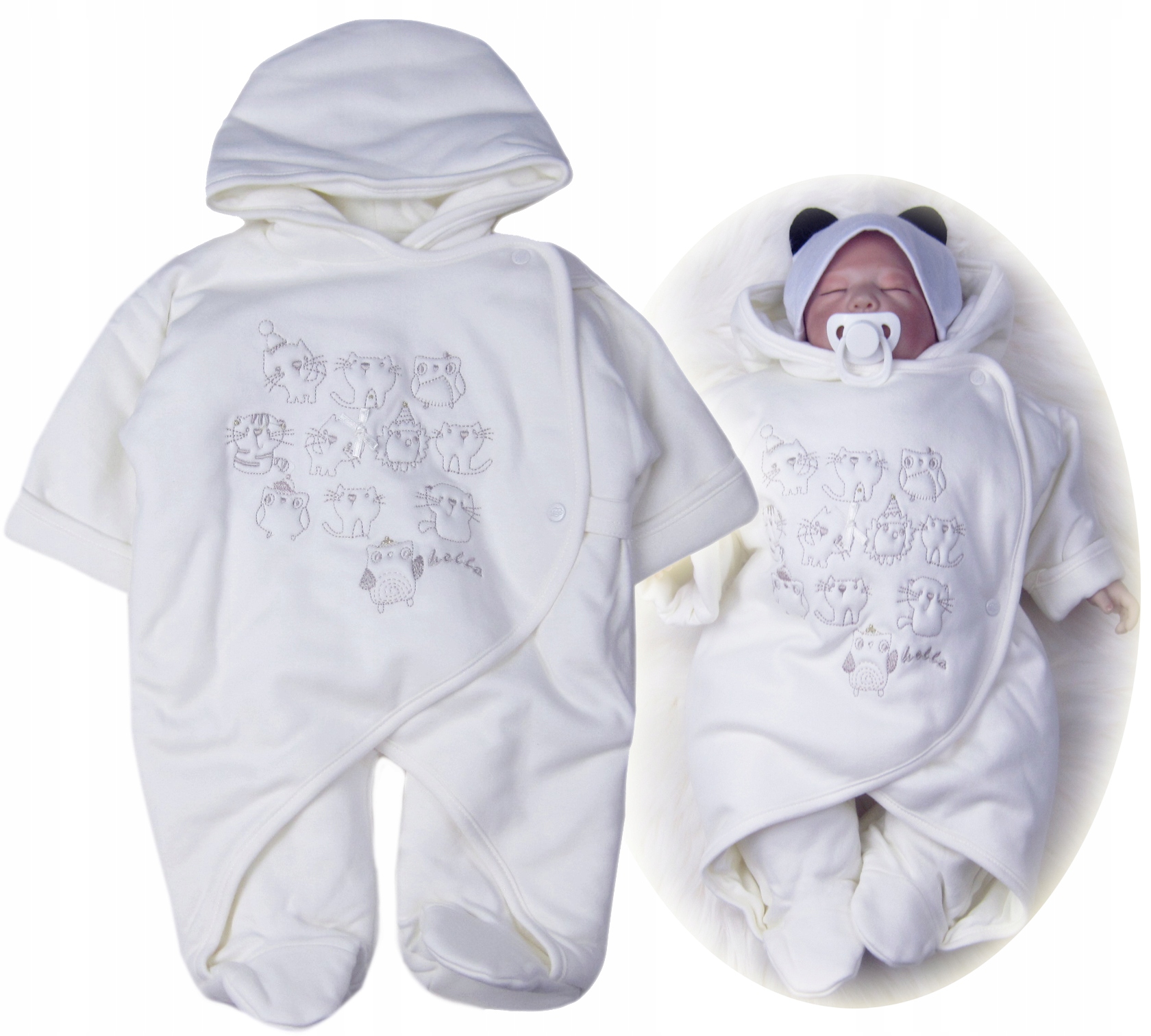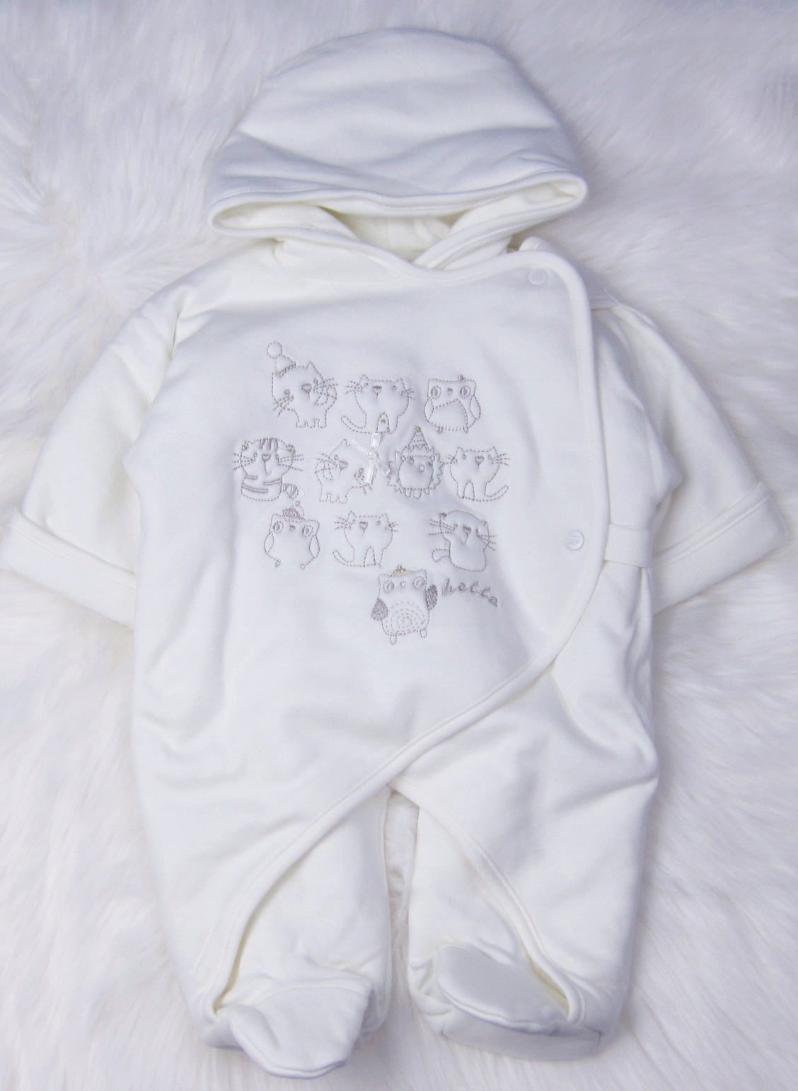 - Комбинезон слегка кремового цвета - экрю. С капюшоном. Спереди декорирована вышивкой.