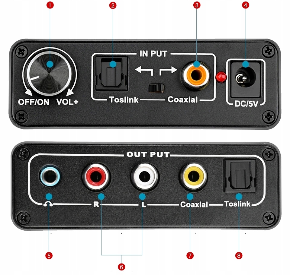 - Конвертер, предназначенный для преобразования цифрового аудиосигнала с коаксиального входа/входа Toslink в аналоговый стереозвук.
