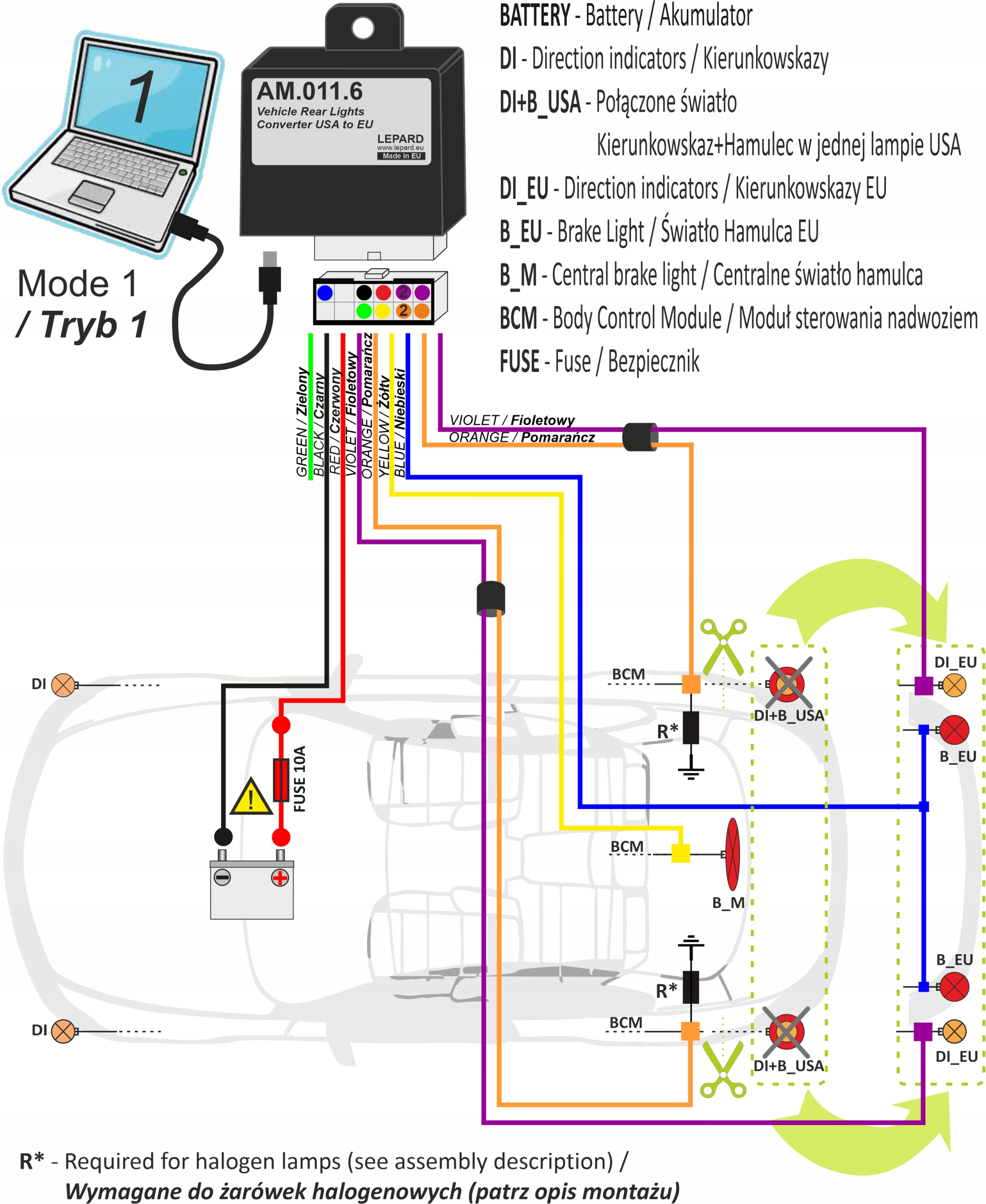 Модуль AM.011.6 разделяет эти фонари на отдельные выходы для стоп-сигнала и указателей поворота в соответствии с европейскими требованиями.
