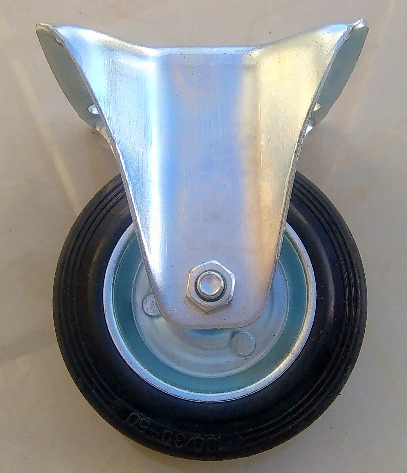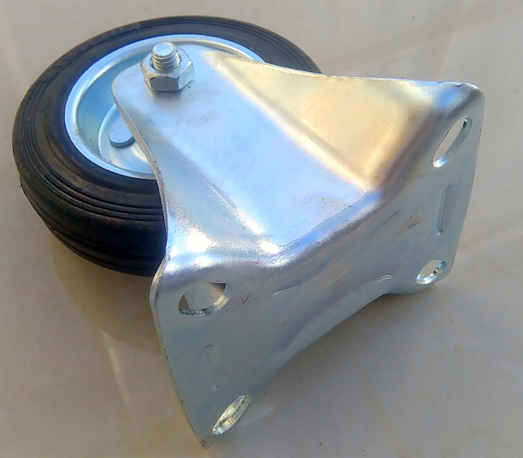 Колеса установлены на так называемых Пластина представляет собой комбинацию вилки из прессованного стального листа, колеса со стальной ступицей и шины из твердой черной резины. Поворотная головка вилки имеет двойные подшипники и защищена от грязи специальным пылезащитным уплотнением. Все металлические элементы комплекта покрыты антикоррозийным хромоцинковым покрытием. Тормоз блокирует колесо и головку.