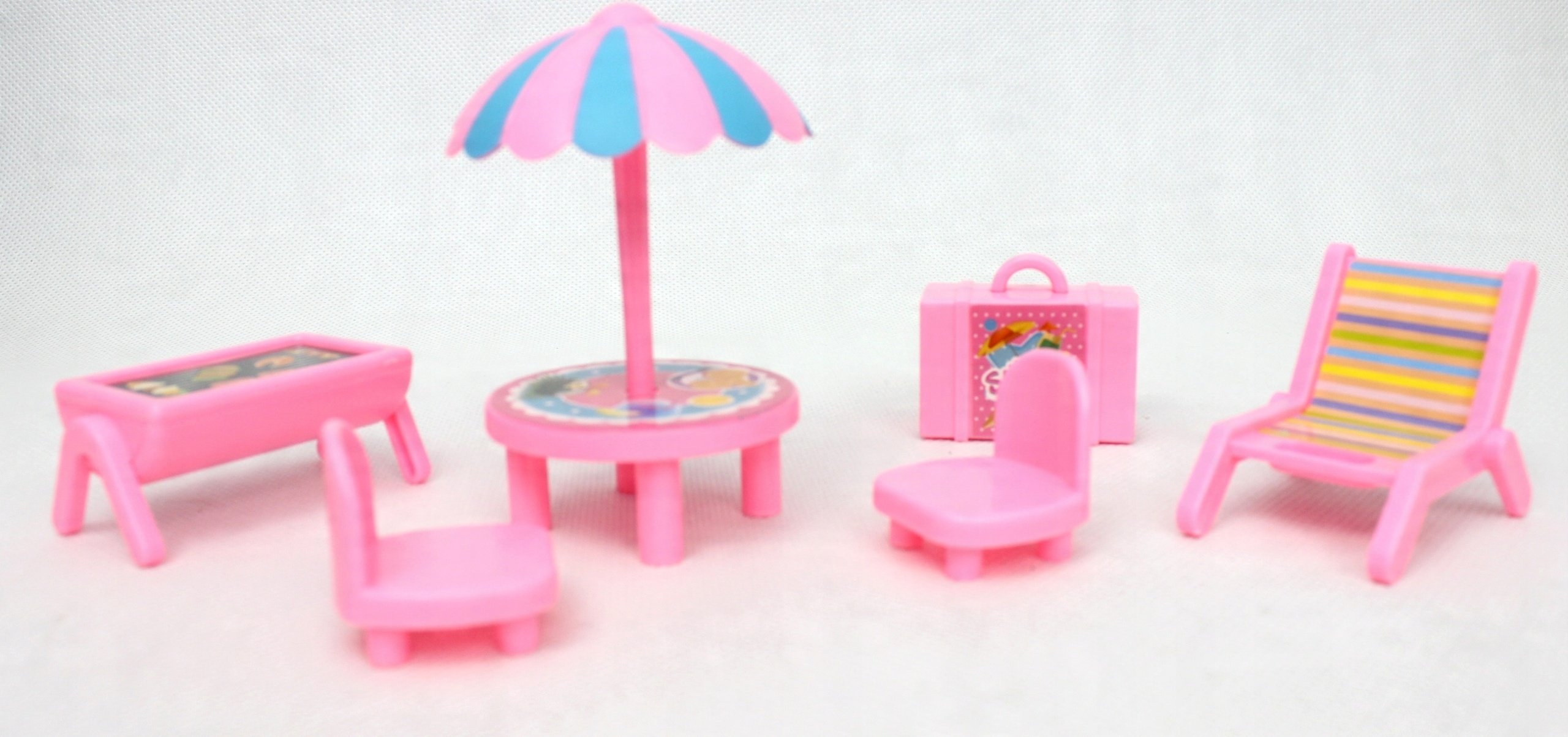В комплект также входит набор розовых стульев и зонтик, который защитит кукол от чрезмерного солнца.