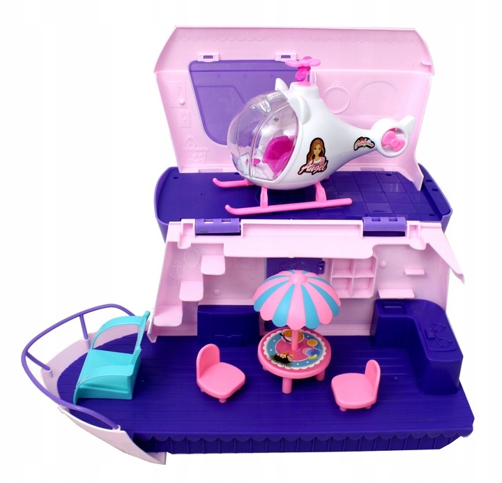 В набор также входит большой бело-розовый вертолет, из которого куклы часто забираются, когда погода для круиза на яхте просто неподходящая.