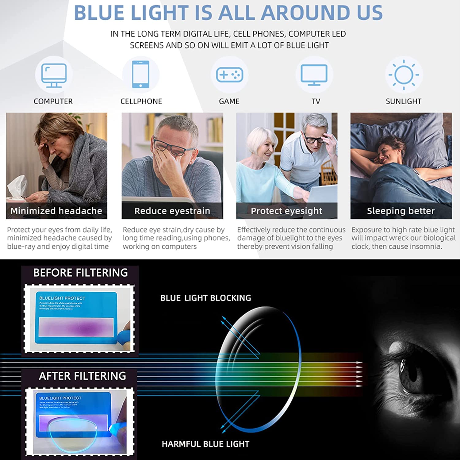 【Линзы, блокирующие синий свет】Линзы, блокирующие синий свет, могут свести к минимуму повреждение глаз. Снимет нагрузку с глаз от длительного чтения, работы и просмотра, улучшит сон и предотвратит головные боли.