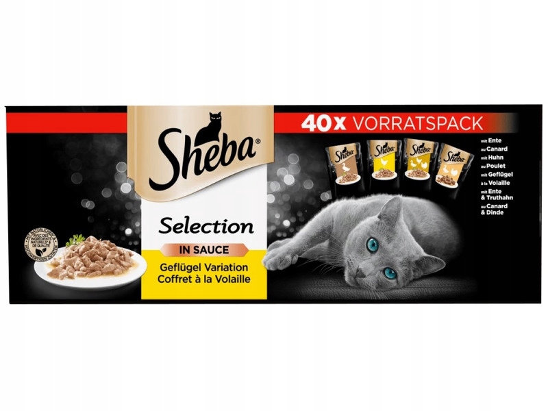 SHEBA® Selection In Sauce в восхитительном соусе представляет собой превосходную композицию высококачественных блюд в 4 уникальных вкусах - с курицей, с индейкой, с уткой и с птица. Мясные кусочки, погруженные в восхитительный соус, приготовленные из отборных ингредиентов по специальному рецепту. Благодаря этому пища сочетает в себе превосходный вкус и полную пищевую ценность.