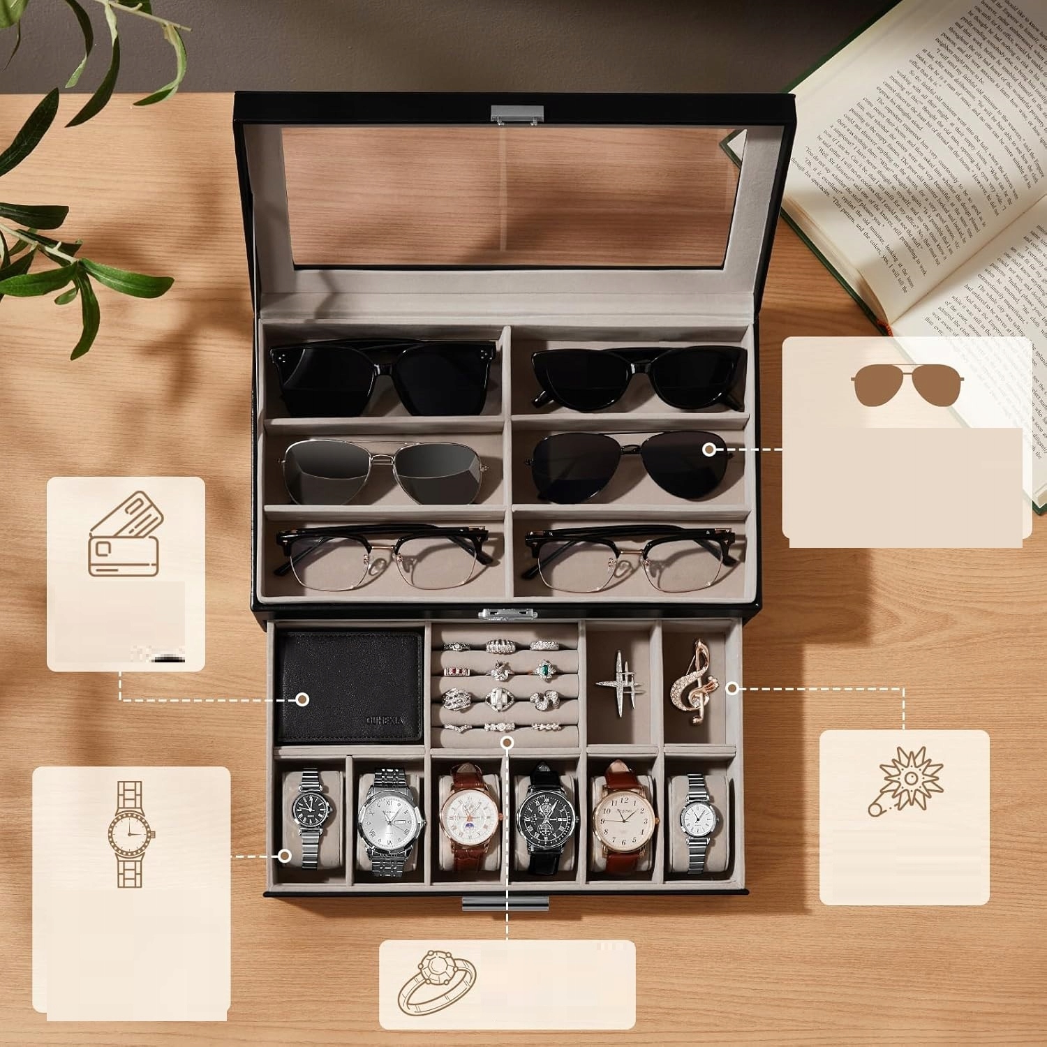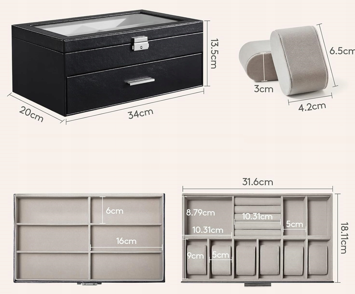 ✅ Двухслойная конструкция. Верхний слой с 6 отделениями и съемными перегородками обеспечивает много места для очков, часов, колец и украшений.