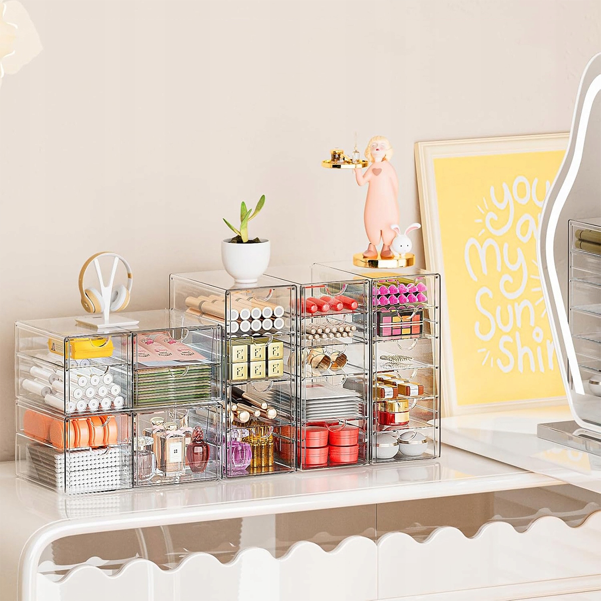 - Наш настольный организатор предоставляет беспрецедентные возможности для организации. Набор из 2 ящиков с 7 ящиками идеально подходит для хранения косметики для макияжа, таких как помада, розовый, фундамент, бронзер, тушь, тени для век, лак для ногтей, а также личные предметы, такие как ювелирные изделия и солнцезащитные очки, и даже все офисные принадлежности, такие как ручки, бумажные ткани, карандаши, маркеры, маркеры, линии, линии и рассеяния.