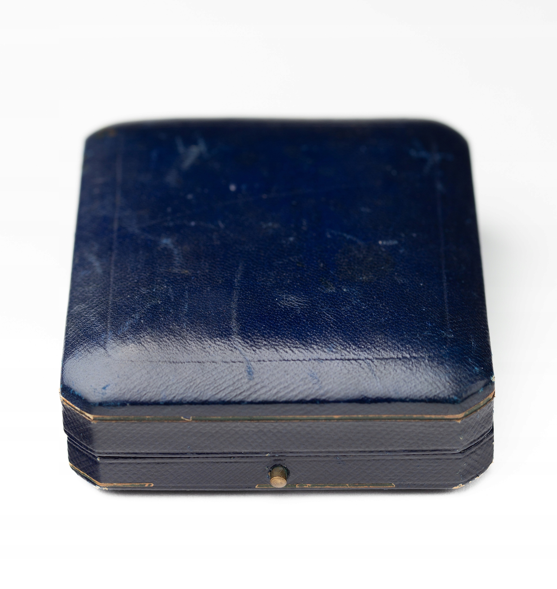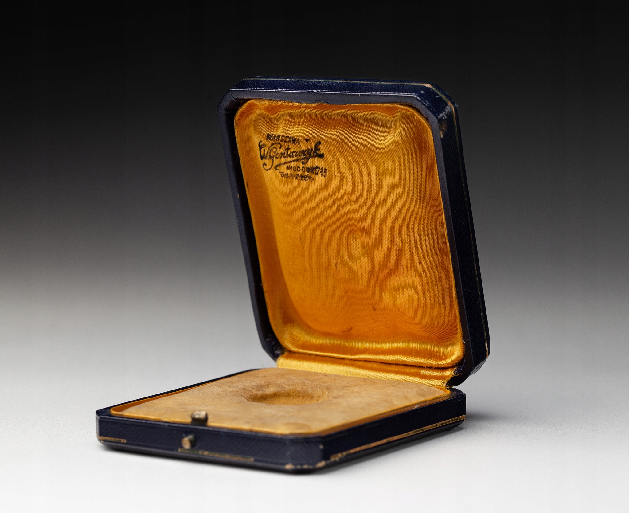 Предмет аукциона — оригинальная эксклюзивная шкатулка для офицерского полкового значка от фабрики Виктора Гонтарчика. Коробка прямоугольной формы со слегка скошенными углами, обтянута темно-синей кожей, внутри имеется отверстие под гайку диаметром 27 мм (большую гайку). Внутри штамп с подписью изготовителя: «Варшава | В. Гонтарчик | Медова 19».
