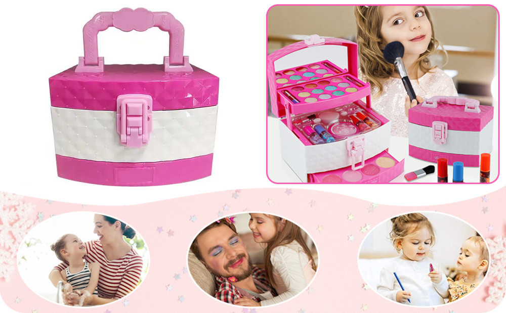 Косметика, помещенная в футляр, полностью безопасна, сертифицирована, не вызывает аллергии и очень легко смывается. Лак для ногтей очень легко удаляется с ногтевой пластины без использования жидкости для снятия. Просто вымойте руки под водой и потяните слой лака, и он снимется сам. Ребенок смывает макияж с лица водой.