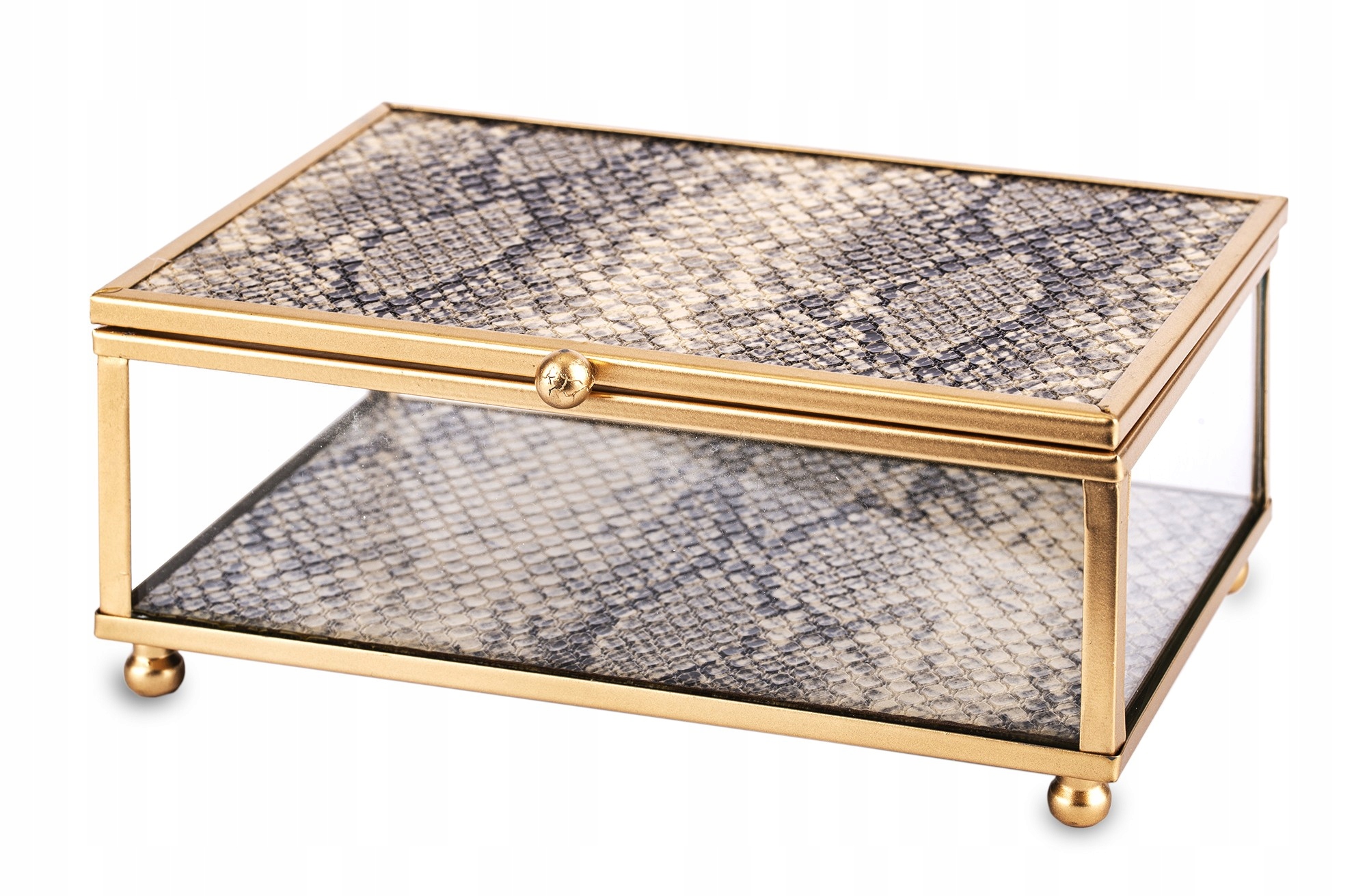Шкатулка для украшений из стекла на металлическом каркасе. Контейнер имеет практичную крышку, открывающуюся сверху. Крышка и дно коробки покрыты мотивом «Змеиная кожа».Шкатулка стоит на небольших металлических шариках.Каркас прозрачного органайзера золотой.Универсальная форма прекрасно впишется в современные и гламурные интерьеры.Практическая шкатулка облегчит хранение мелких вещей, украшений или часов.
