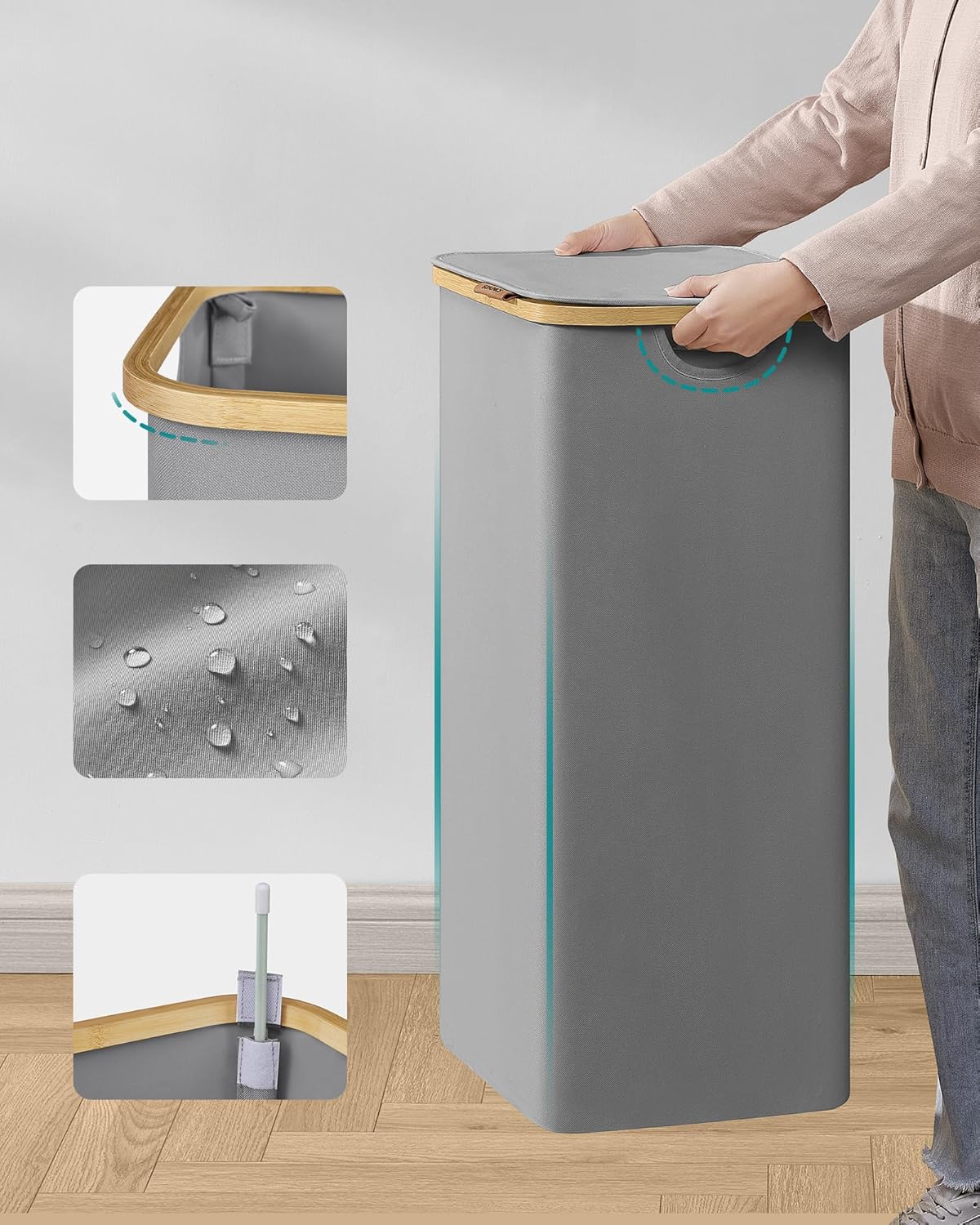 Стильная корзина для белья объемом 90 л — это идеальное сочетание функциональности и элегантности. Его размеры 42 x 32 x 70,5 см обеспечивают достаточно места для примерно недели стирки для одного человека, что значительно облегчает ежедневные обязанности.