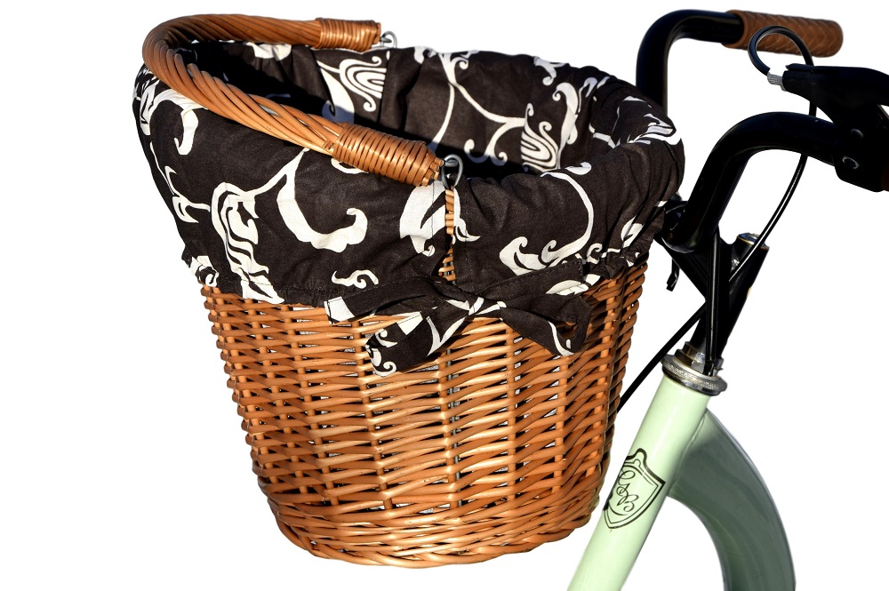 Плетеная велосипедная корзина с крючками + ПОДКЛАДКА - цвет отделки на выбор (100% хлопок) - идеально подходит для велосипедных поездок, покупок, а также для перевозки собаки или кошки. Очень прочная конструкция гарантирует, что покупки будут осуществляться в безопасном и удобном положении. Корзина размещается на передней части руля с помощью изогнутых металлических стержней, защищенных специальным пластиком.