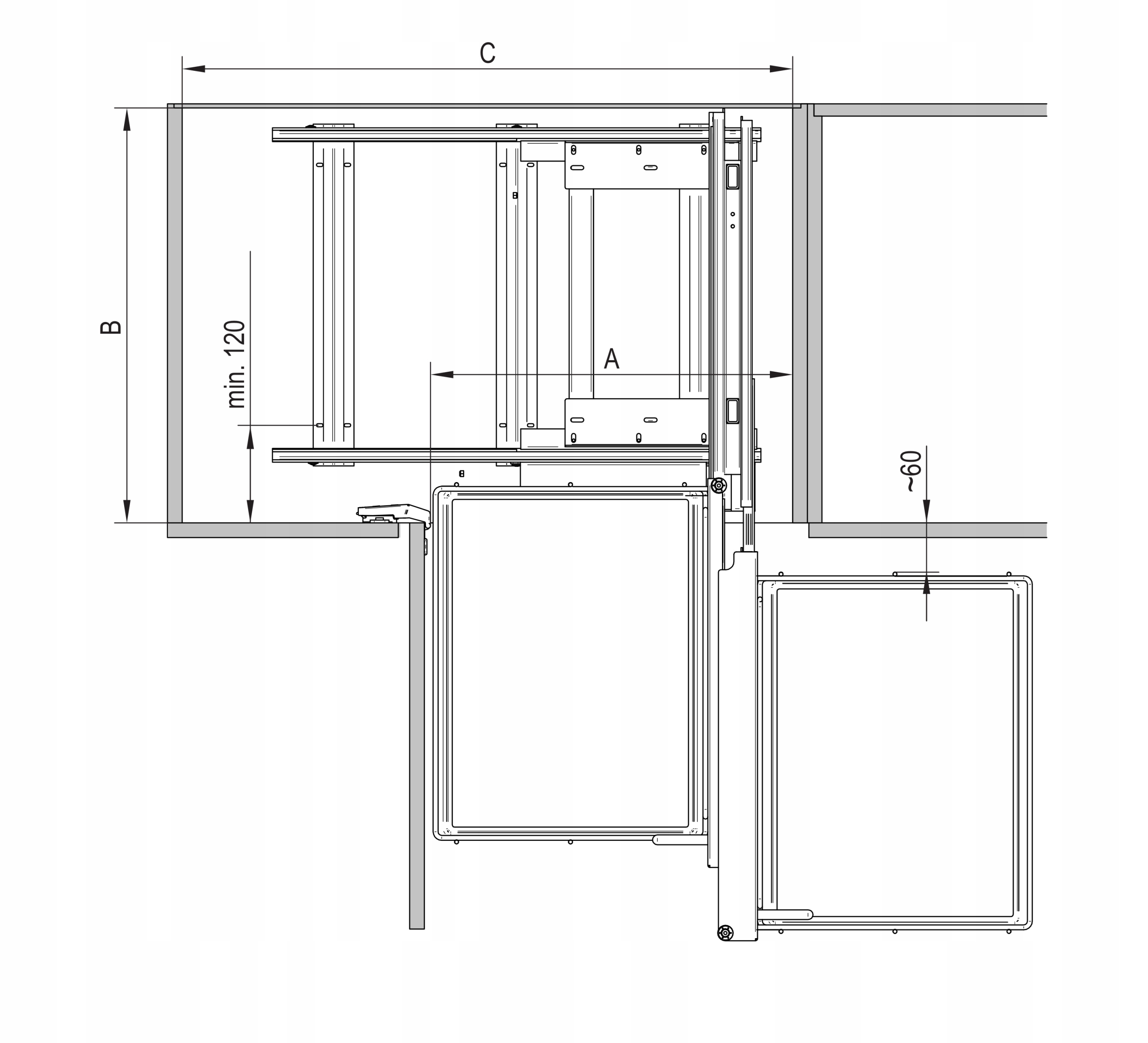 Использование специального приводного решения в конструкции полок позволяет каждой корзине выдвигаться отдельно в двух последовательностях, совершая плавное движение. б>. Это позволит вам добраться до задней части шкафа. Кроме того, вы можете выдвинуть корзины за пределы шкафа.