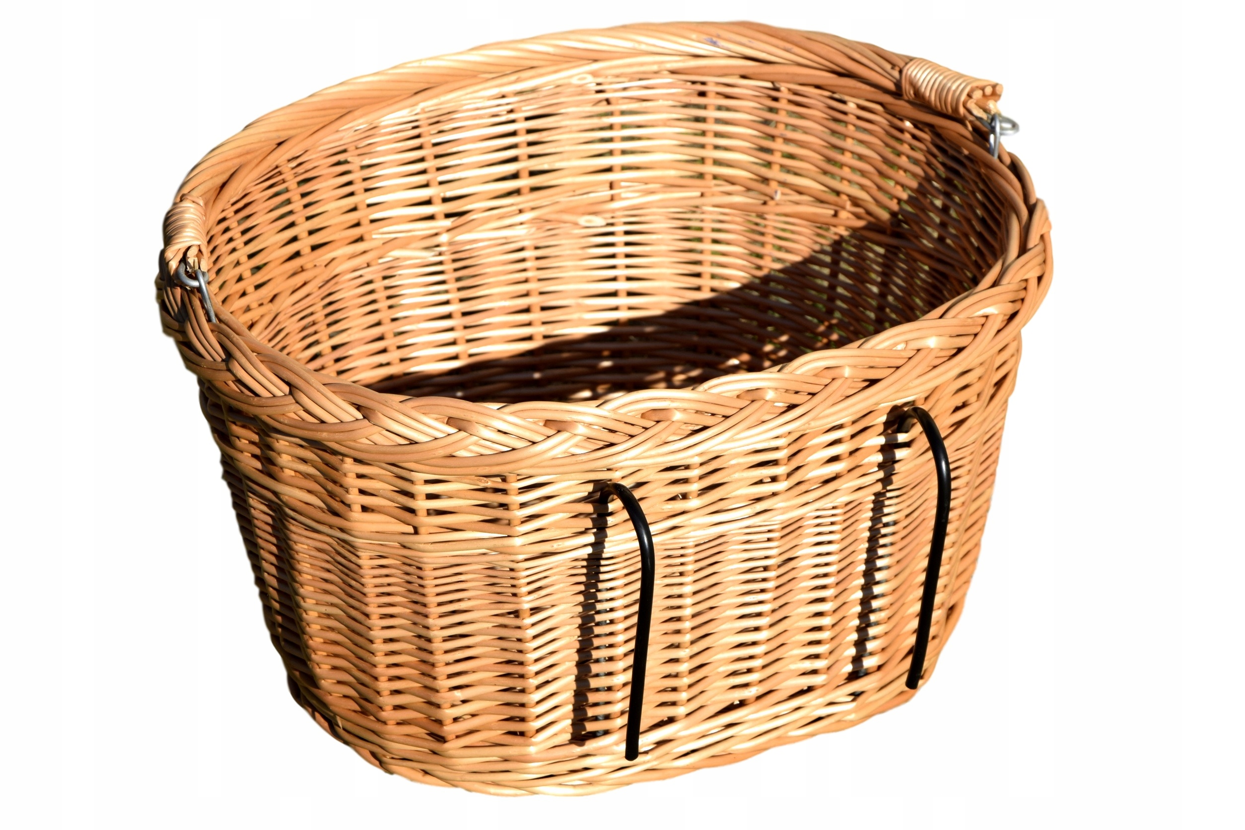 Плетеная велосипедная корзина — идеально подходит для поездок на велосипеде, покупок или перевозки собаки или кошки. Очень прочная конструкция гарантирует, что покупки будут осуществляться в безопасном и удобном положении. Корзина размещается на передней части руля с помощью изогнутых металлических стержней, защищенных специальным пластиком.