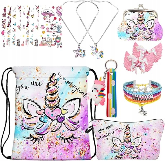 В комплект входят: 1 классический рюкзак с единорогом на шнурке, 1 косметичка с единорогом, 1 ожерелье с единорогом, 1 браслет с единорогом и 5 резинок для волос с единорогом.
