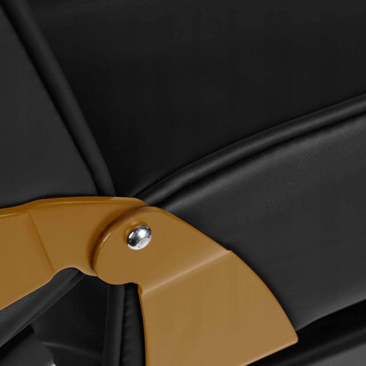 Металлическая рама - благодаря полуматскому отделке в оттенках старого золота и гладких ног - выглядит элегантно и не перегружает пространство . Основание стула имеет фиксированную высоту, поэтому сиденье находится на неизменном уровне, что должно обеспечить комфорт во время использования . В кресле наполнено пеной и покрыто подражанием кожи в оттенках черного. Благодаря использованию такого материала, оборудование удобно в использовании, устойчиво к влаге и легко чистить . Правильно профилированный подол, дающий эргономичную форму место. Простой дизайн и классические цвета позволяют ему вписаться в любой интерьер.