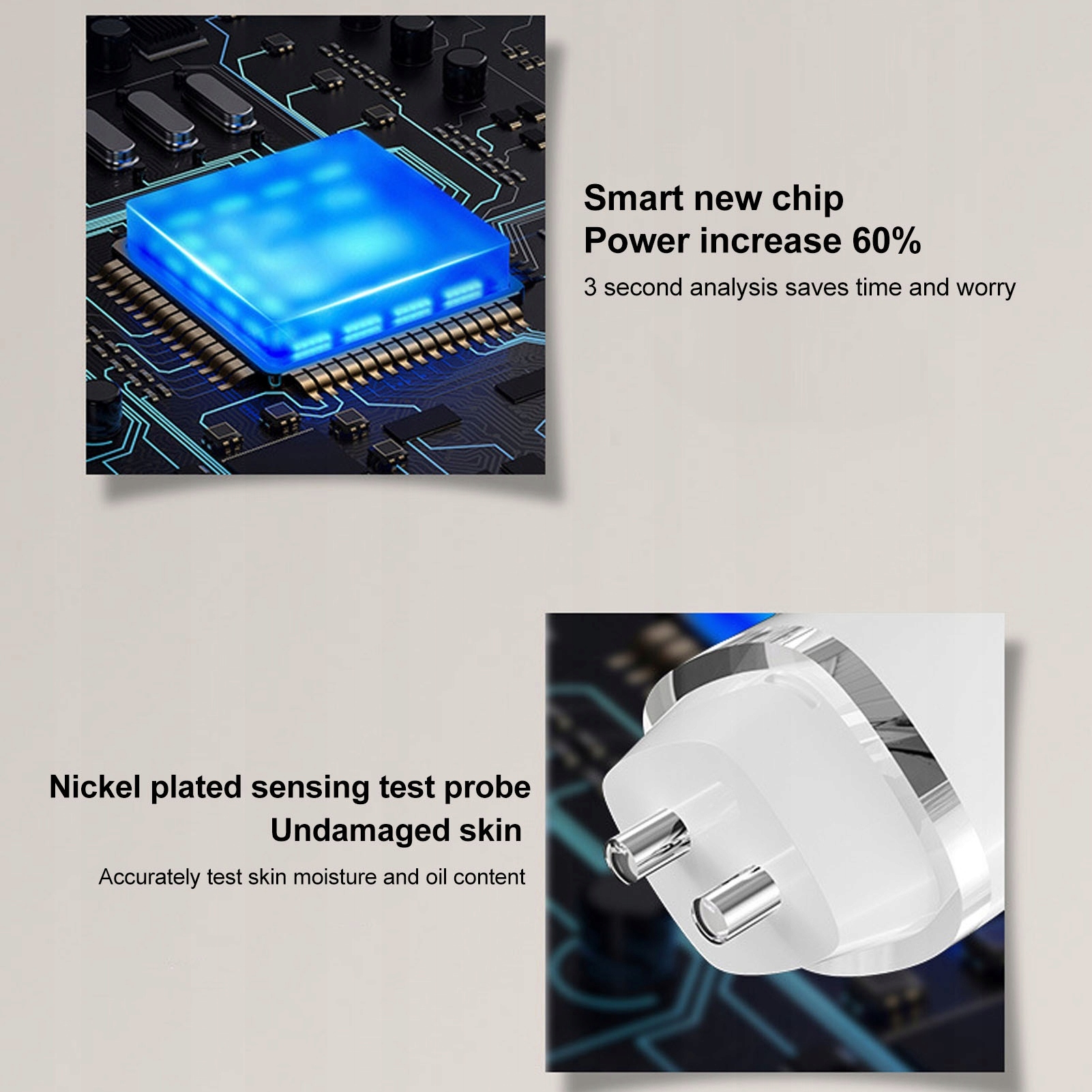 2. Интеллектуальная система: за счет увеличения мощности до 60% экономится время, обеспечивая при этом точное измерение уровня влажности кожи и уровня масла.