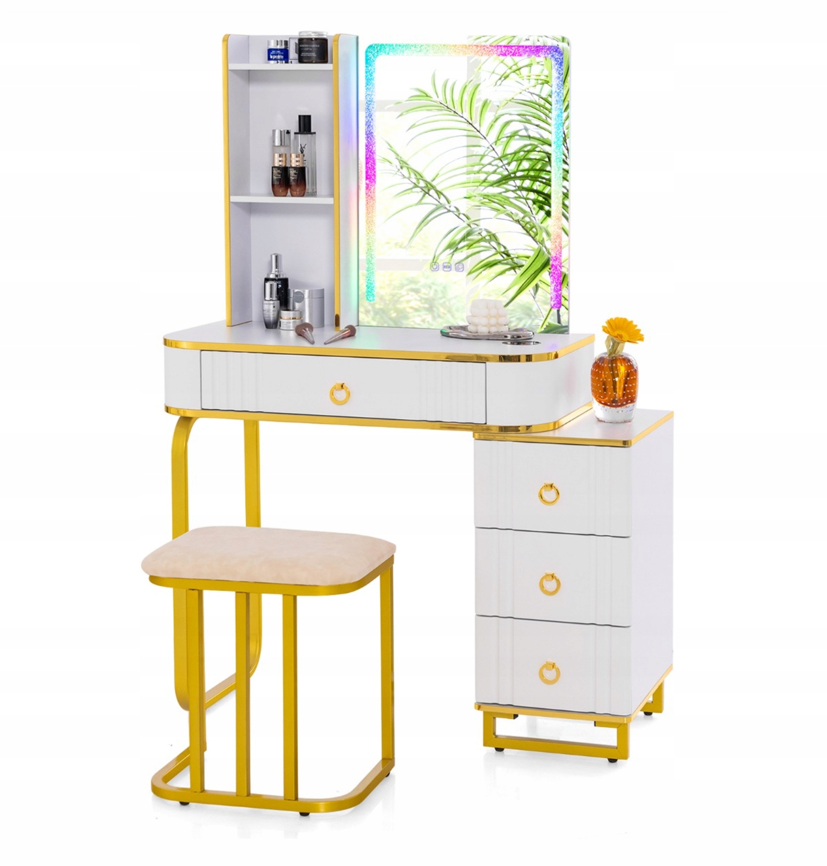 7 Динамические моды RGB и 7 статических мод RGB создают различные световые эффекты и позволяют вам найти желаемую атмосферу. Операция проста с сенсорным переключателем и пультом дистанционного управления. Этот туалетный столик также обладает большой емкостью, включая полки и ящики. Большой ящик под столешницы разделен на несколько отсеков, покрытых мягкой подкладкой, которые предназначены для хранения украшений. Обитый стул доставлен с туалетным столиком, который вместе обеспечивает больший комфорт во время утренней рутины.