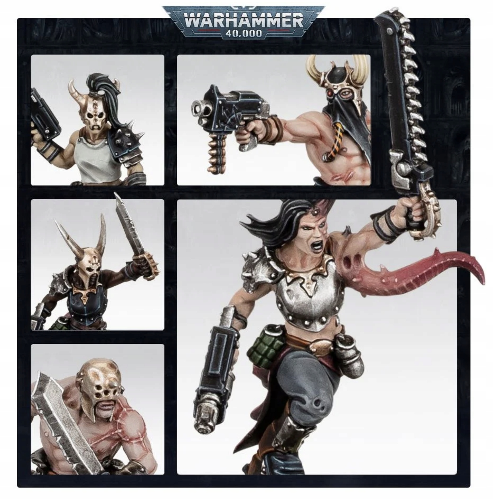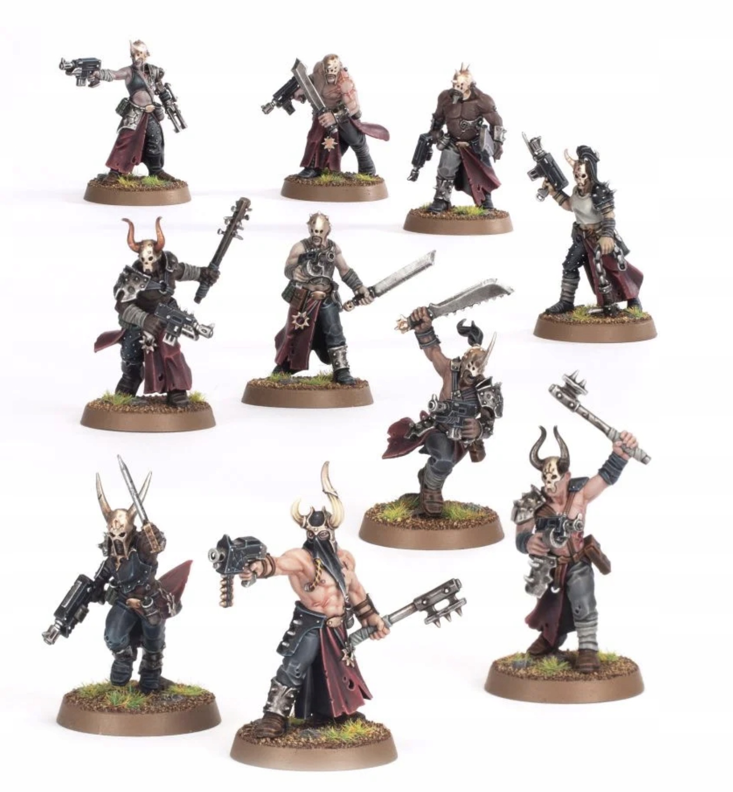 Культисты Хаоса — смертные приверженцы Темных Богов, обычные мужчины и женщины, выполнившие обещания смертной силы. Под командованием могущественных военачальников-еретиков такие фанатики выходят на поле боя огромными толпами культистов. Это кощунственное ополчение бросается в бой с разнообразной коллекцией импровизированного, украденного и самодельного оружия, подавляя даже решительных врагов своей численностью. Этот пластиковый набор, состоящий из нескольких частей, состоит из 10 культистов Хаоса, каждый из которых оснащен той или иной комбинацией автоматического пистолета, жестокого оружия штурмовое оружие, осколочные гранаты и краковские гранаты. Эти модели могут похвастаться всевозможными извращенными деталями: от символов Хаоса и подвесок до демонических масок и мантий, а также оружием, от примитивного бионика до свирепых мачете. В набор входят два культиста, которых в качестве альтернативы можно создать как Чемпионов-Культистов: мутировавшего Чемпиона-Культиста с голой рогатой головой и рукой с щупальцами, владеющего цепным мечом, или Чемпиона-Культиста-мужчины с разорванной маской и болт-пистолетом.