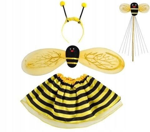 В комплект входят юбка, крылышки, повязка на голову и палочка. Набор из 4 предметов обеспечивает практичное использование. Наряд визуально привлекателен, отличается интересным внешним видом и эстетичной отделкой элементов. Короткая расклешенная юбка на резинке эластична и идеально прилегает к телу. Мягкий материал обеспечивает комфорт, а желтые и черные полосы добавляют привлекательности. Крылья с блестящей золотой аппликацией изготовлены из легкого полупрозрачного материала. Эластичные ленты гарантируют быстрое и легкое надевание. Повязка имеет плюшевые усики на пружинках и фурнитуре из перьев, а палочка украшена декоративными лентами и очаровательной пчелкой. Универсальный комплект удобен и подойдет каждому ребенку, независимо от его роста и веса.