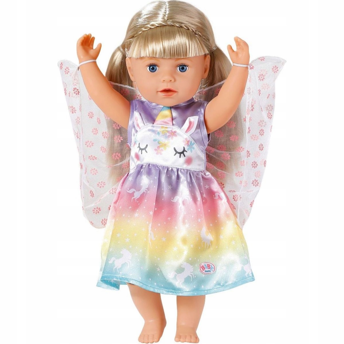 Радужное платье рассчитано на куклу ростом 43 см. У них юбка с рюшами, покрытая, в том числе и сверху, нежным тюлем. В передней части юбки преобладает изображение головы единорога, крылья также имеют декоративный характер. Платье, являющееся костюмом, застегивается на липучку.