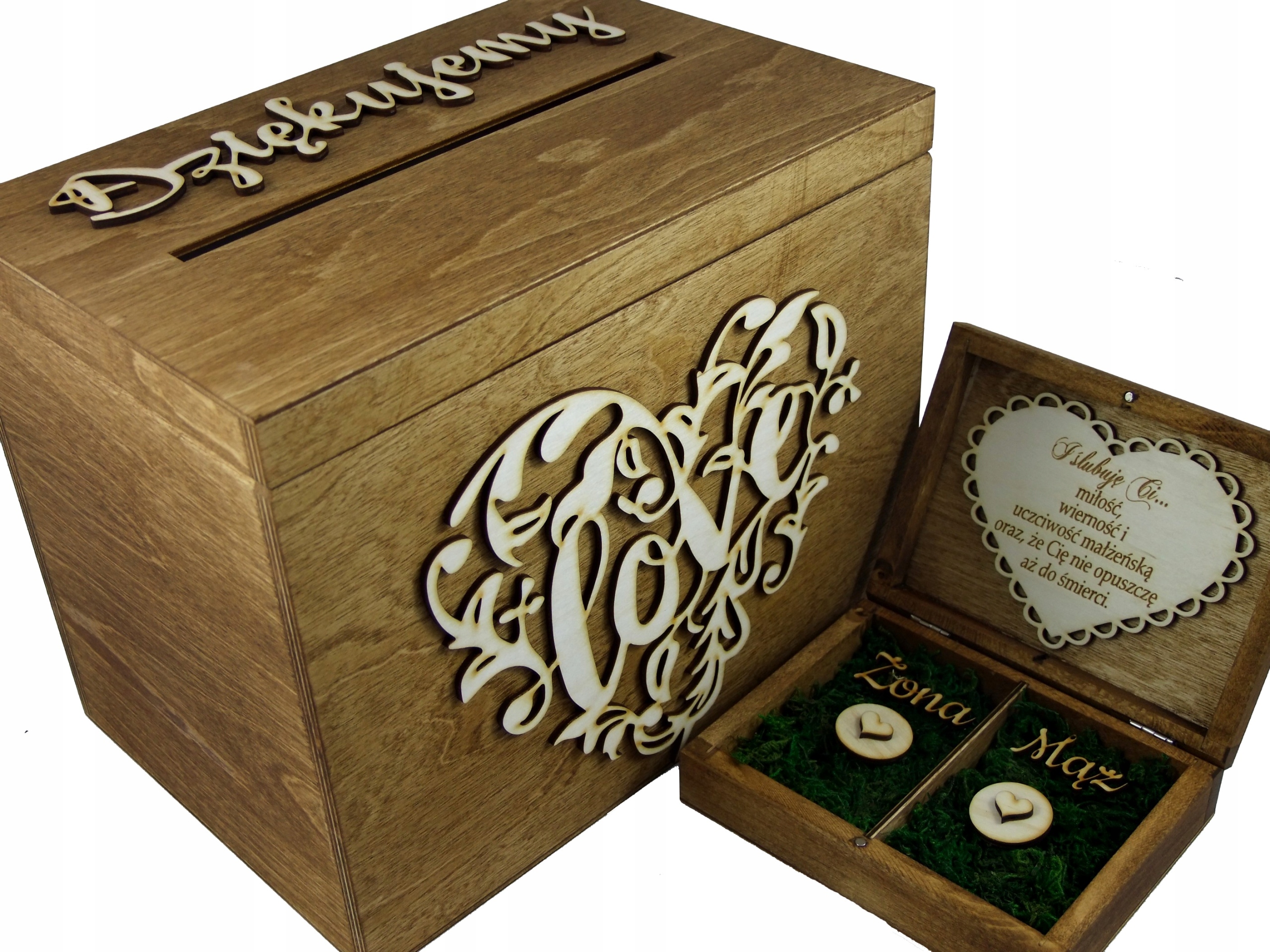 Наполнение - красивый зеленый мох с вырезанными надписями Жена и Муж