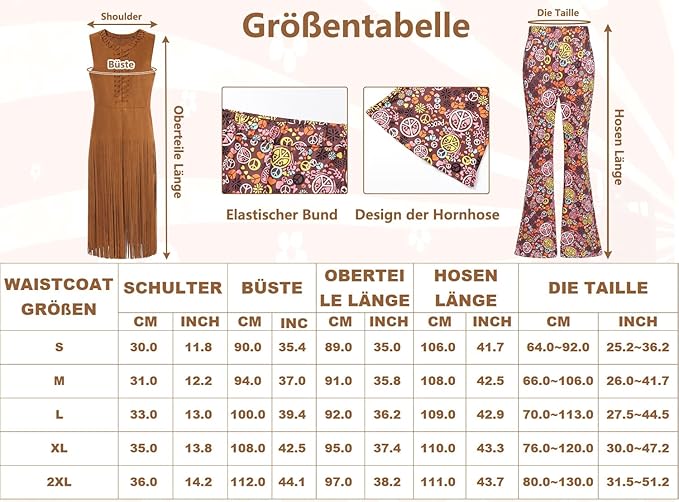 - Примечание. Если вы сжигаете полосы этого жилета без рукавов хиппи, не волнуйтесь, просто расчесывайте пальцы, чтобы облегчить его. Благодаря этому костюму хиппи для женщин, вы можете создавать различные стили, такие как стиль хиппи, уличная фотография, западный ковбойский стиль, путешествия во времени, диско и многие другие. Это платье хиппи для женщин - идеальный выбор для ретро -мероприятий, таких как тематические события 1960 -х, 70 -х, 80 -х годов, карнавал, карнавал, карнавальный карнавальный вечер, роза в понедельник, вечеринка по случаю дня рождения, карнавал во вторник, большой размер, еженедельная неделя и гораздо больше