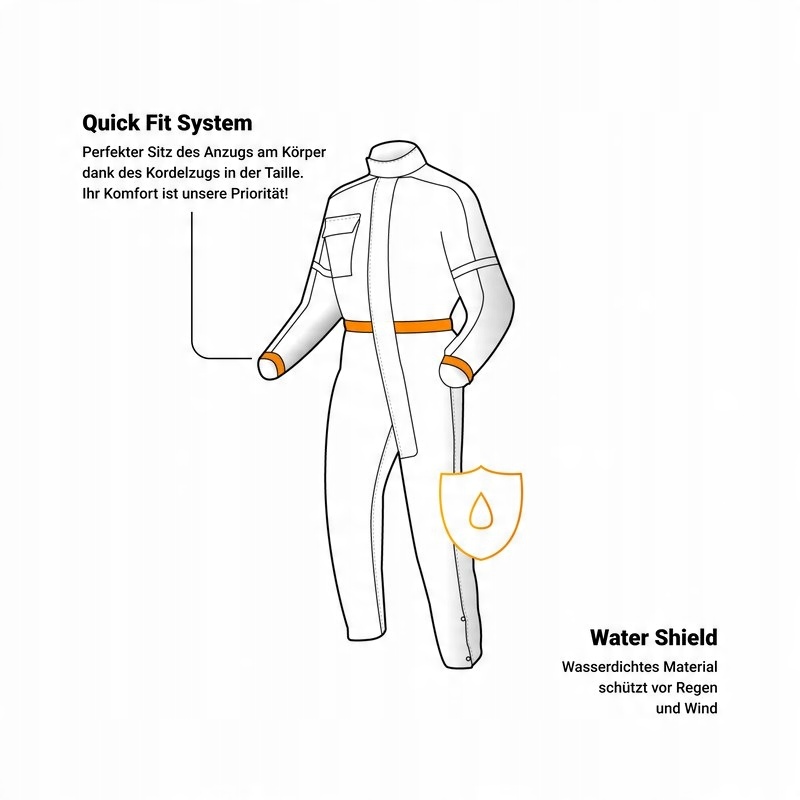 Мотокостюм с полиэстер и ПВХ со светоотражающими вставками. Покрыты ламинатом для предотвращения протечек. Его очень легко надевать и регулировать благодаря длинной молнии и шнуркам на талии, штанинах и запястьях. Имеет карман для документов и воротник, отделанный мягким материалом.