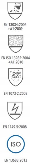 • EN ISO 13982-1:2004+A1:2010 – Одежда, защищающая от твердых частиц – ТИП 5