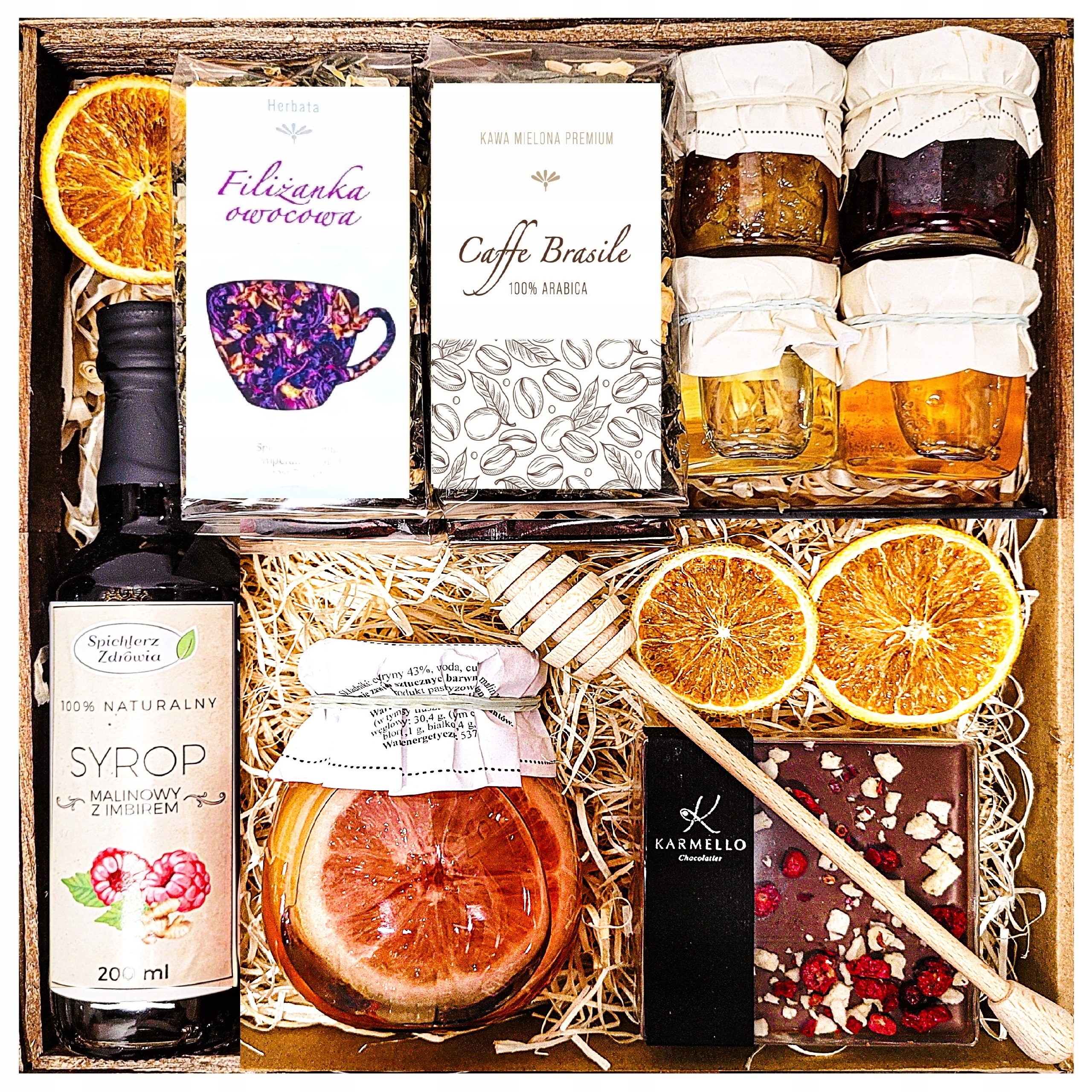 ПОДАРОЧНАЯ КОРЗИНА ПОДАРОК ЧАЙ МЕД ШОКОЛАДНЫЙ СИРОП МАЛИНА КОФЕ