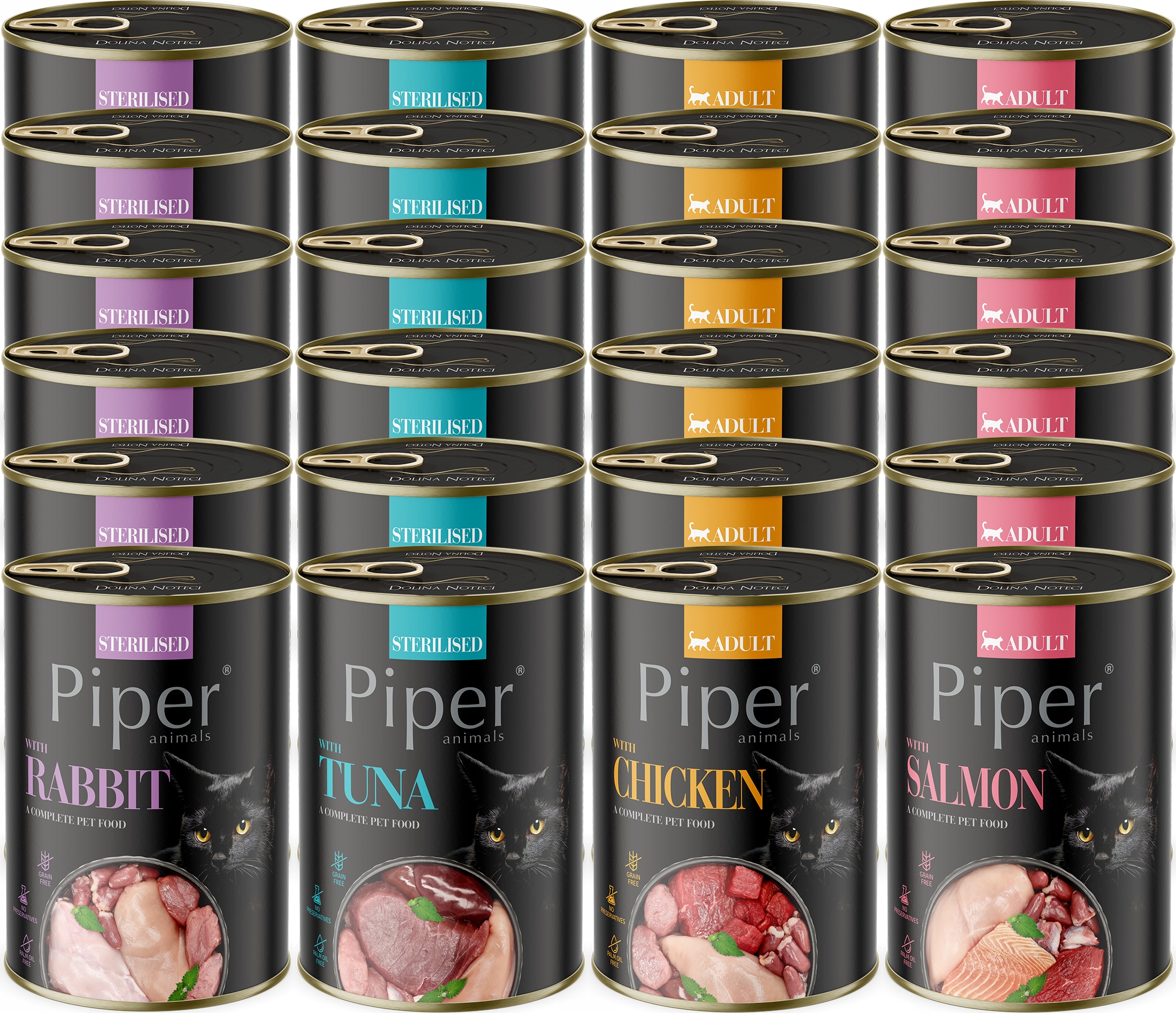 Piper Animal Food -это живой продукт с полным времени, который покрывает 100% ежедневную потребность в всех питательных веществах, минеральных и витаминов для взрослых котенок/ кошек всех пород с умеренной физической активностью, оставаясь в удобных условиях окружающей среды, а не беременной или лактации. Он был сбалансирован с точки зрения содержания питательных веществ на основе современных питательных норм и рекомендаций по правильному питанию. Обеспечивает правильное поддержание минерализации костей и зубов и правильного курса всех метаболических процессов.
