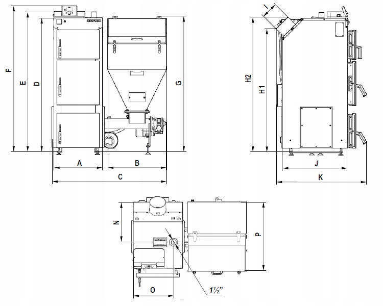 A - чугунная решетка горелки, B - уплотнительный шнур, C - чугунный венец горелки, D > - стальной винт, E - саморазблокирующийся мотор-редуктор, F - прокладка угольного бака эко-горошка, G - доработка Труба подачи угля эко-горошка, H - труба подачи угля эко-горошка, I - вентилятор с расходомером, J - воздуховод, < б>К - патрубок системы выравнивания давления воздуха, L - капилляры термодатчиков, М - разъем пожарной системы пожаротушения, N - уплотнительный шнур, O - проверка горелки, U - корпус горелки.