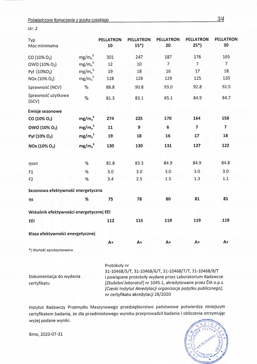 Котлы серии ПЕЛЛАТРОН имеют класс 5 по стандарту PN EN 303-5: 2012! Это стандарт на топливо отопительные котлы огневые СТАЦИОНАРНЫЕ с ручной и автоматической загрузкой топлива номинальной мощностью до 500 кВт. Классифицирует печи по термическому КПД и выбросу вредных веществ в окружающую среду. Этот продукт также сертифицирован ECODESIGN, поэтому он способствует улучшению качества воздуха за счет экономии энергии и топлива