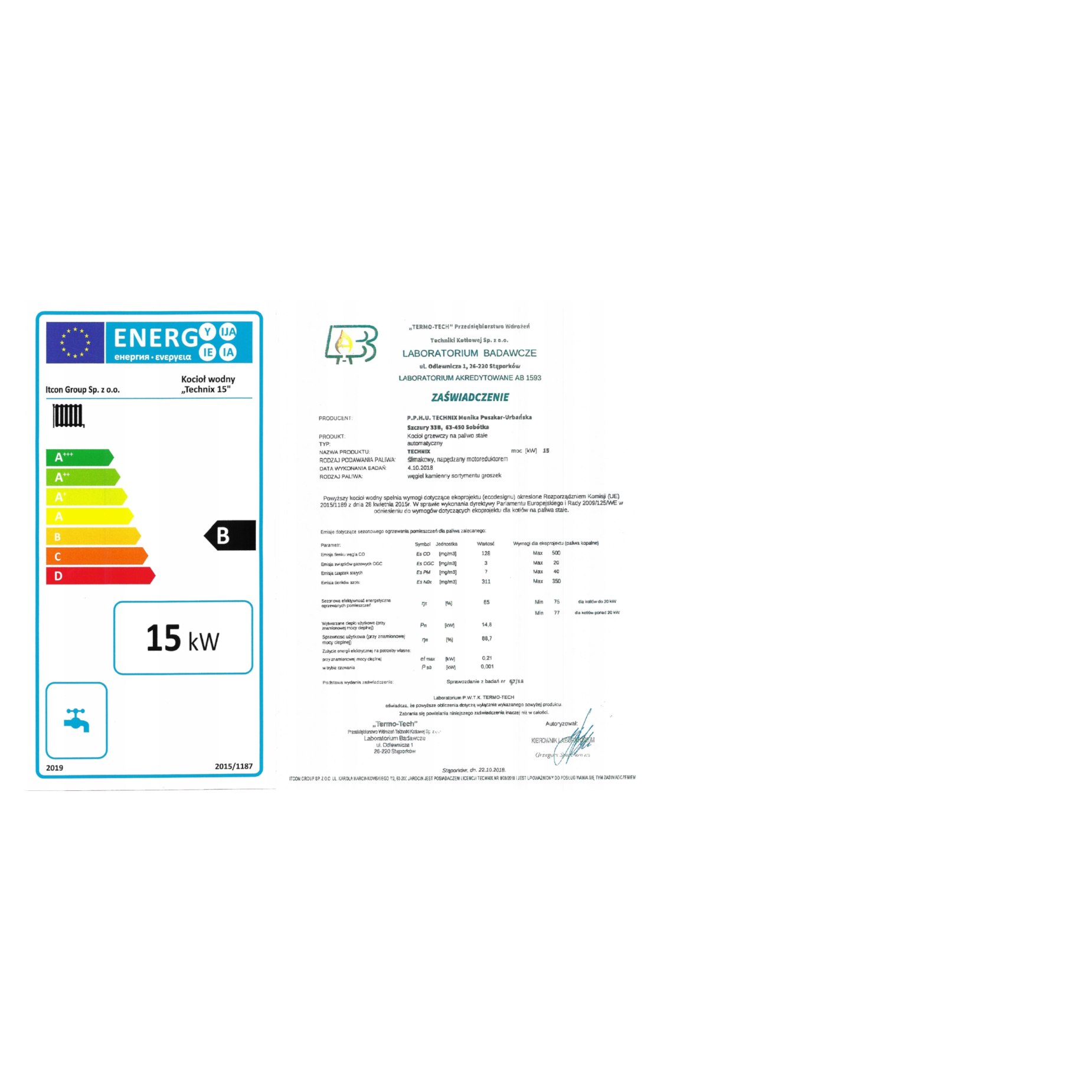 - Котлы с питателем соответствуют требованиям PN-EN 303-5:2012 и экодизайна (2020-2009/ 125/EC) — класс 5/сертификат экодизайна.