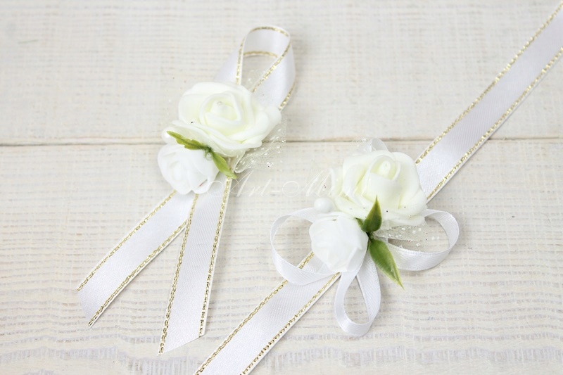 Изготовлен из роз, украшен с тюлем, жемчугом и декоративной травкой, все застегивается на атласные ленты.