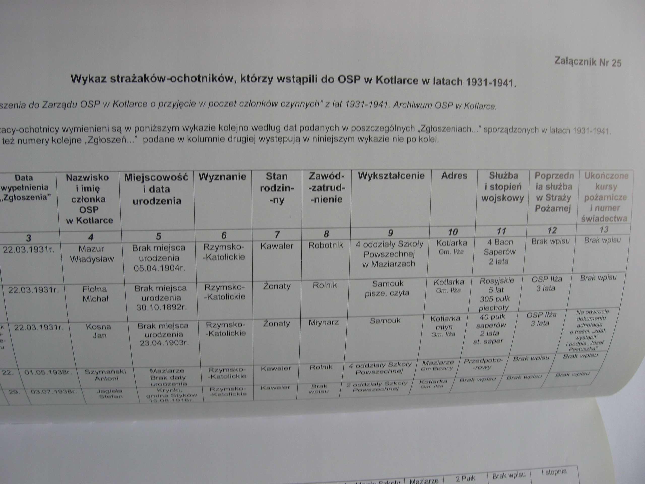 "Добровольная пожарная часть в Котларке была создана в 1922 году сначала как бригада пожарных машин, организационно и оперативно подчиненная Добровольческой пожарной части. Пожарная часть в Илже. В задачи вновь созданного подразделения входила оперативная и быстрая доставка воды, необходимой для тушения пожаров, проводимых головным подразделением.