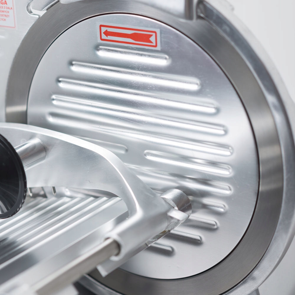 Слайсер имеет регулируемую толщину нарезки в диапазонеот 0 до 10 мм. Небольшие шипы на толкателе предотвращают неконтролируемое перемещение продуктов во время резки. Благодаря этому ломтики всегда будут идеально ровными.