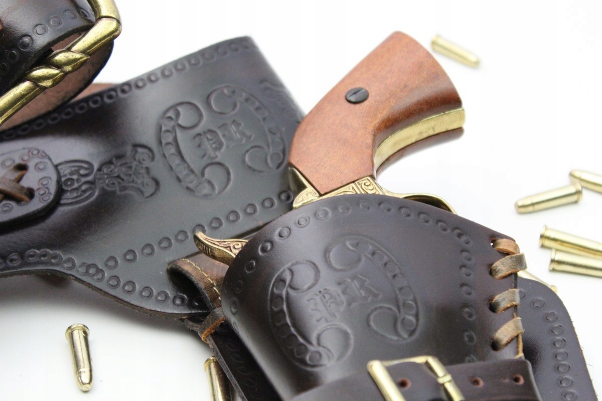 Представленный Вам ковбойский ремень с патронами и кобурой для двух пистолетов представляет собой очень тщательно выполненную, красивую копию из натуральной кожи. Ковбойский ремень – один из главных атрибутов, связанных с ковбойскими и вестерн-фильмами. Ковбой – обычный герой любимых фильмов и книг о Диком Западе, просмотренных многими поколениями. Мы ассоциируем его с человеком с сильным характером, носящим туфли со шпорами, шляпу и пояс, представленный выше, с револьвером на боку. Его постоянным спутником была мощная лошадь и аркан для перегона скота. В наборе 24 картриджа. Коричневого цвета, инкрустация западными мотивами и декоративной пряжкой.