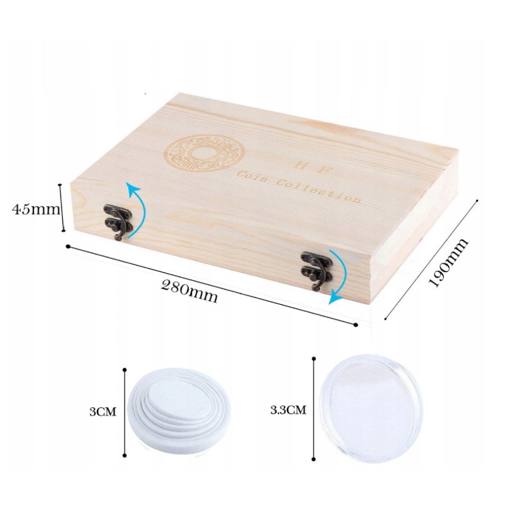 - Ящик для монеты изготовлен из высококачественной сосны с полированной поверхностью и имеет размеры ок. 280 х 190 х 45 мм может вместить 100 кусочков пластиковых капсул для монет, которые являются практичными, долговечными и отлично подходят для сбора монет в разных размерах. Монеты】 :