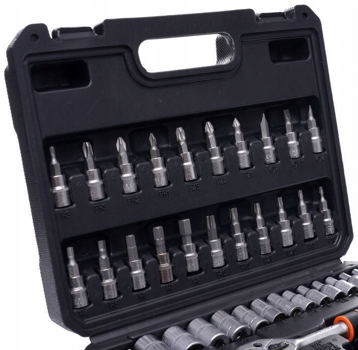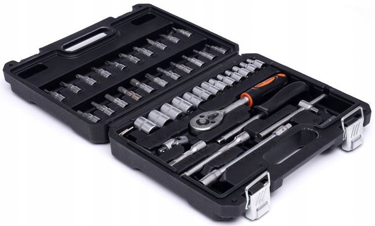 Весь набор состоит из 46 различных элементов, которые обеспечат правильный выбор инструмента для ваших нужд. . Инструменты изготовлены из закаленной хромованадиевой стали (CrV), предназначенной для инструментов мастерских. Хром гарантирует стойкость стали к коррозии, окислению, истиранию и высокую стойкость к высоким температурам. Добавление ванадия сдерживает рост зерен в процессе обработки, одновременно повышая пластичность как закаленных, так и отпущенных форм.