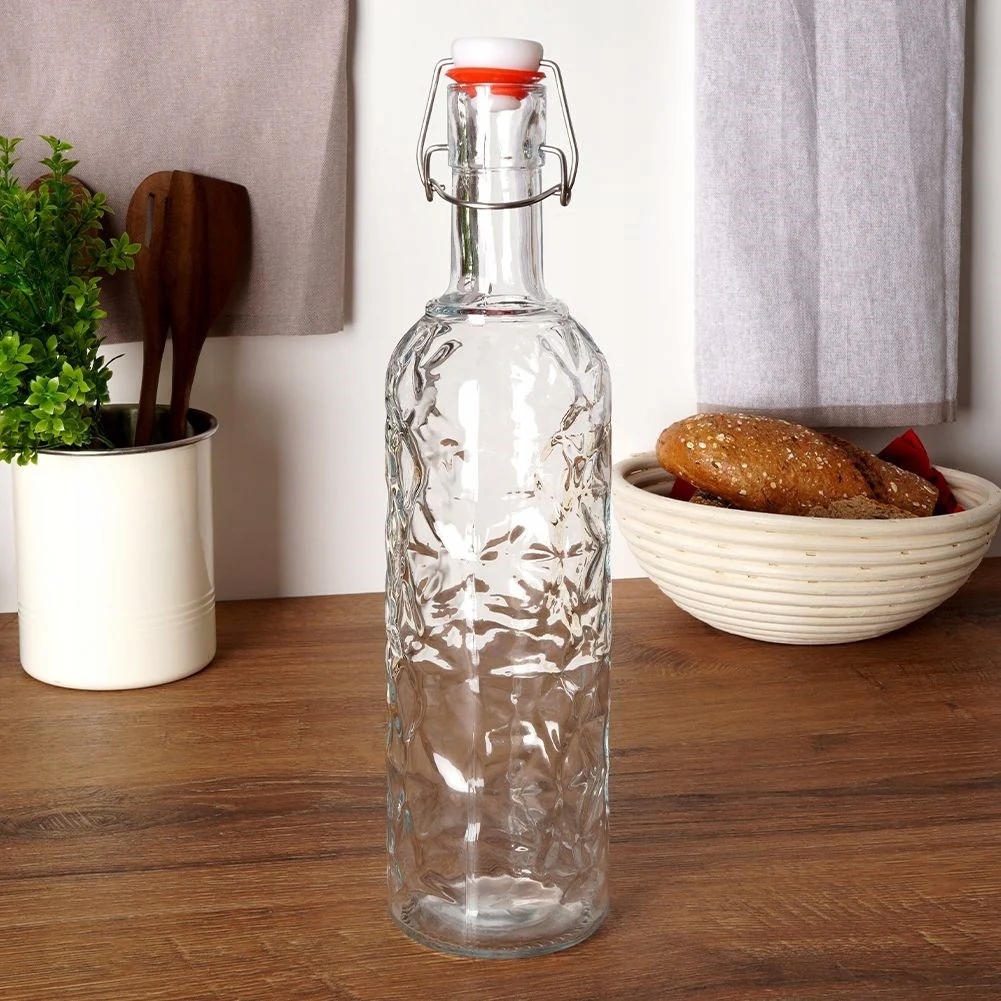 Красивая стеклянная бутылка с пробкой и зажимом для напитков