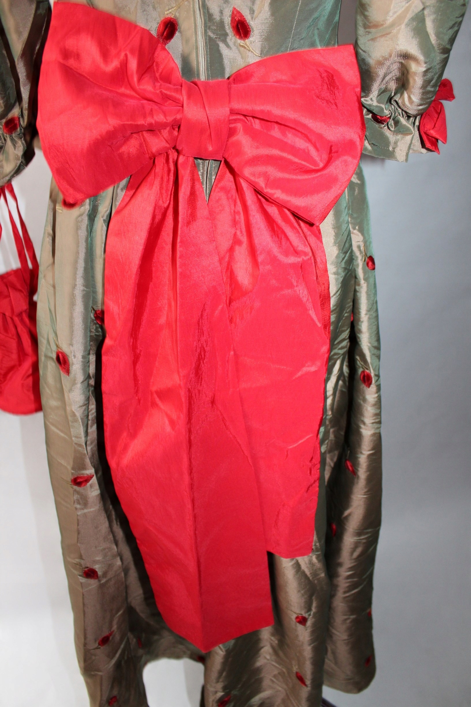 Платье из полиэстера, застегивается на молнию сзади, сумочка - б/у, очень хорошее состояние - нормальные следы использования.