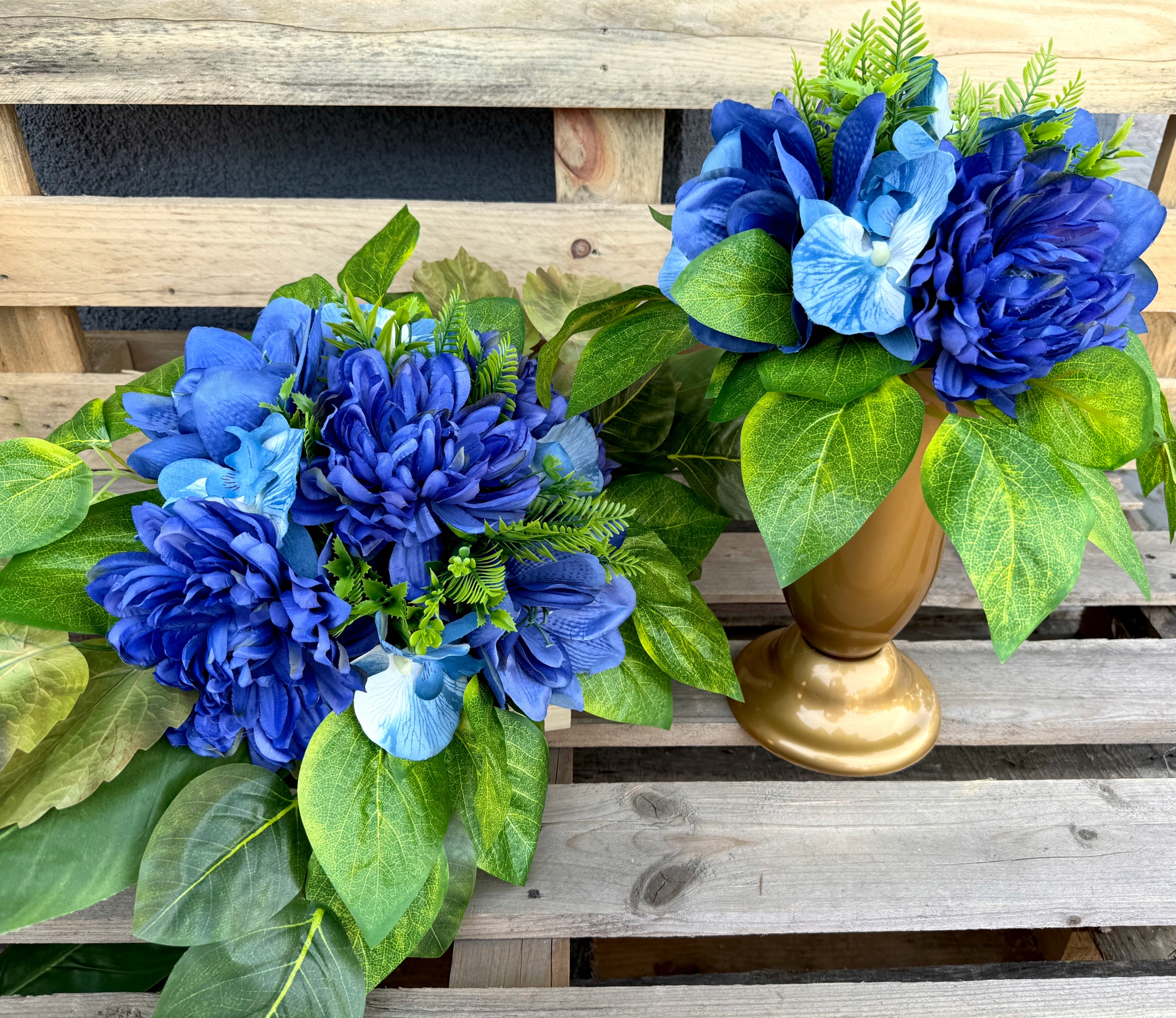 Большой, насыщенный букет и букет на могилу в оригинальном сине-темно-синем цвете. Изготовлен из цветов и искусственной фурнитуры супер-качества.