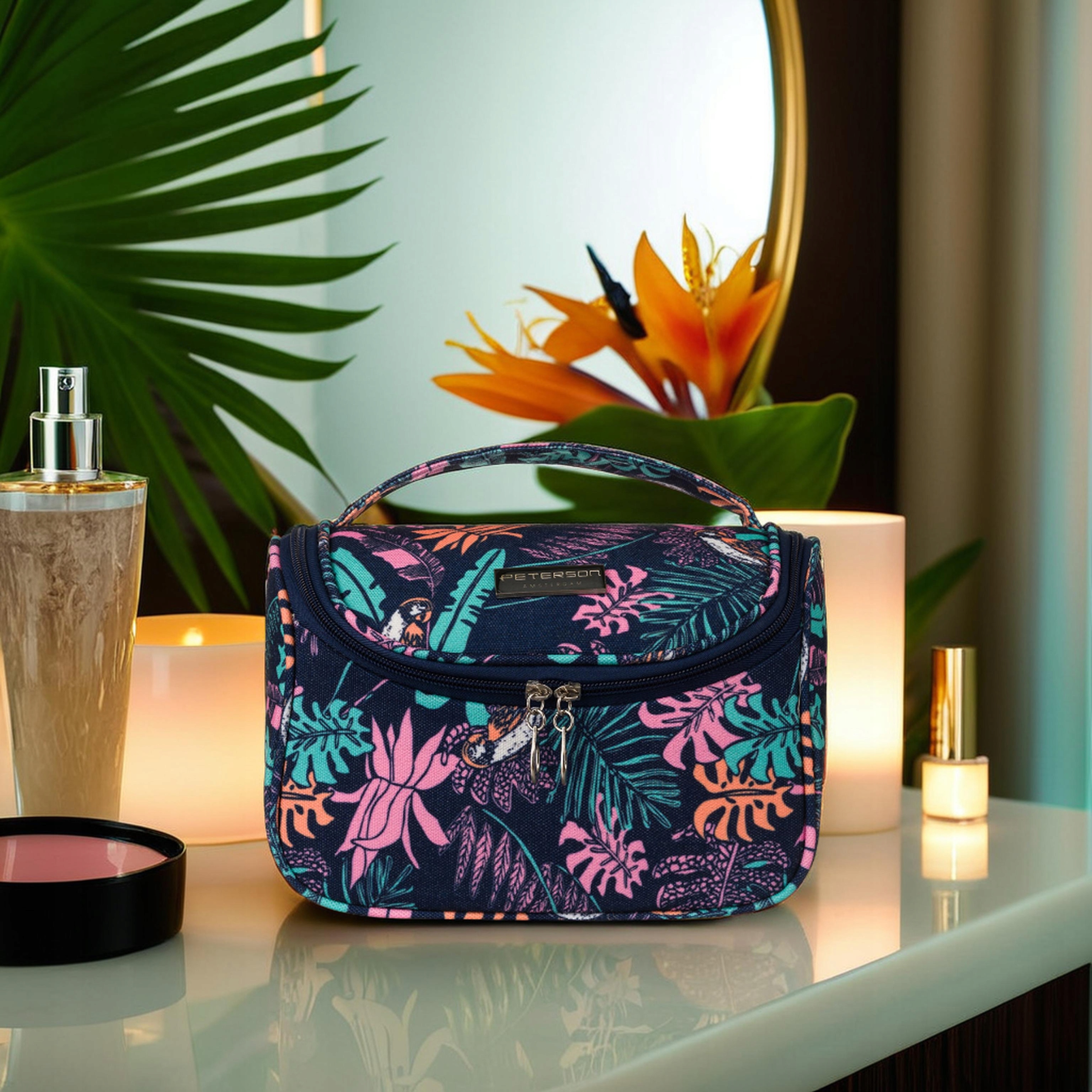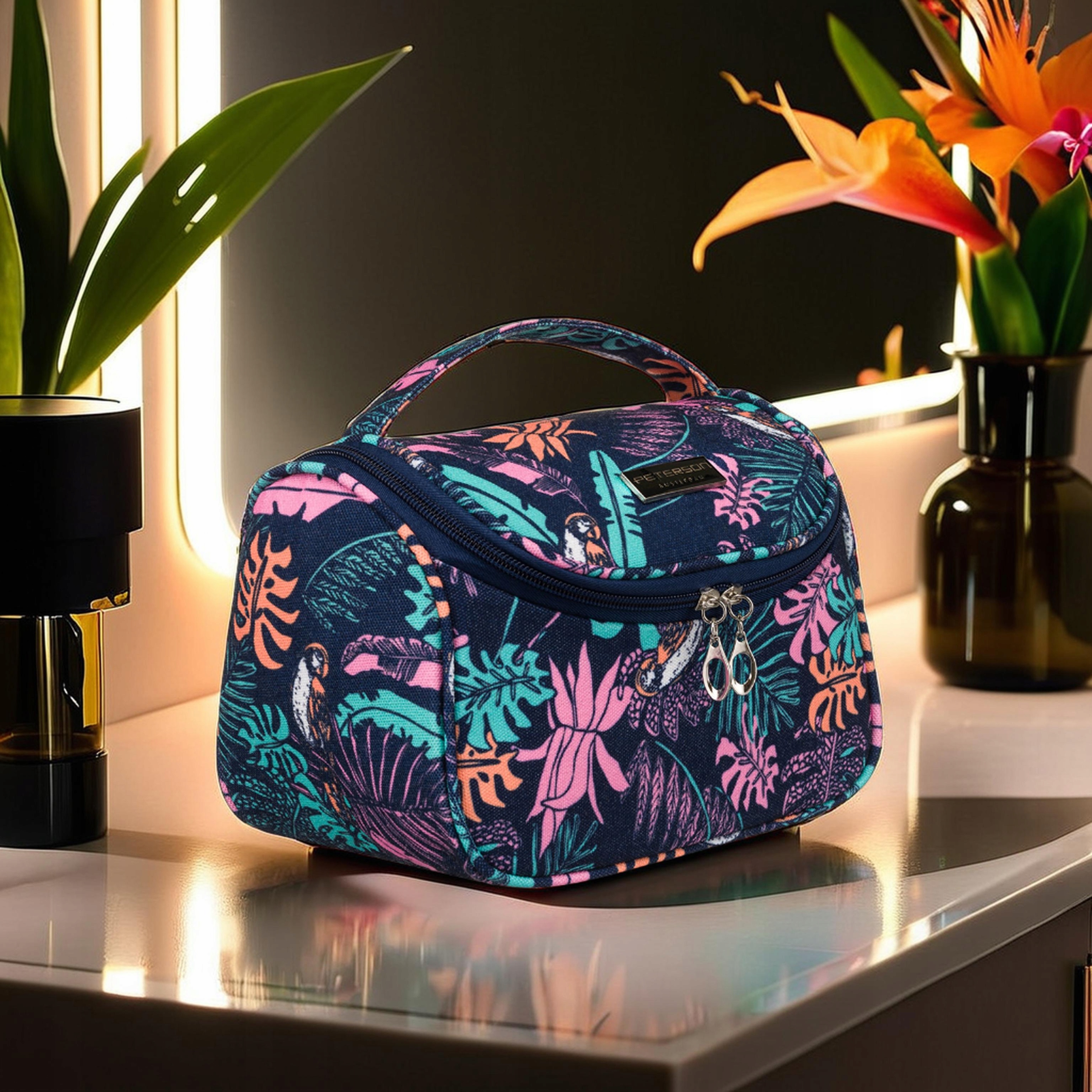 косметолог с экзотическим дизайном. Его внешняя часть изготовлена из мынового синего материала украшен цветочный мотив. на темном фоне листья различных форм в контрастных цветах, таких как зеленый, розовый и оранжевый.