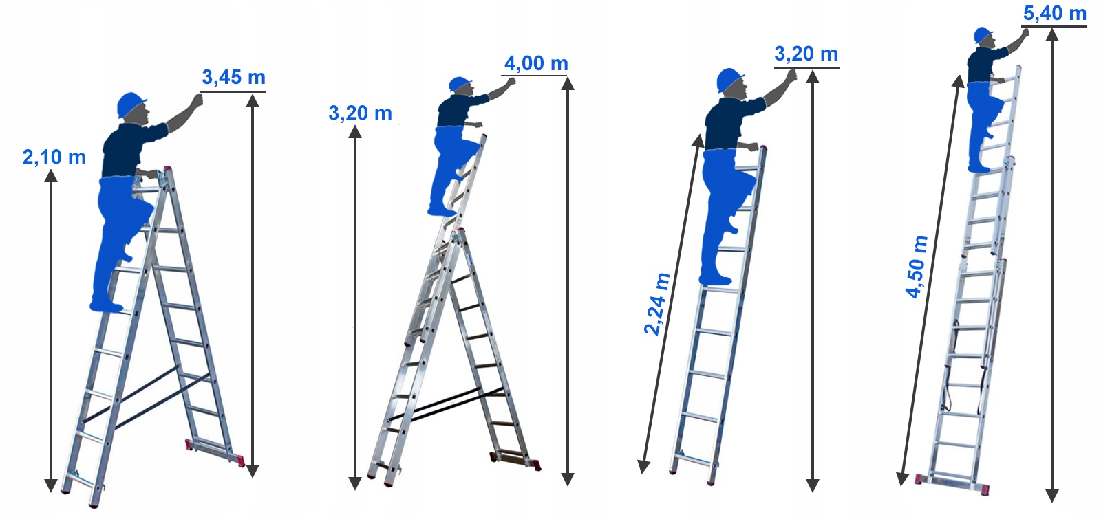 Рабочая высота зависит от высоты и настройки лестницы. Некоторые продавцы предоставляют раздутые аспекты, чтобы убедить вас купить. Мы предлагаем сравнение нескольких предложений для определения фактических размеров лестницы.