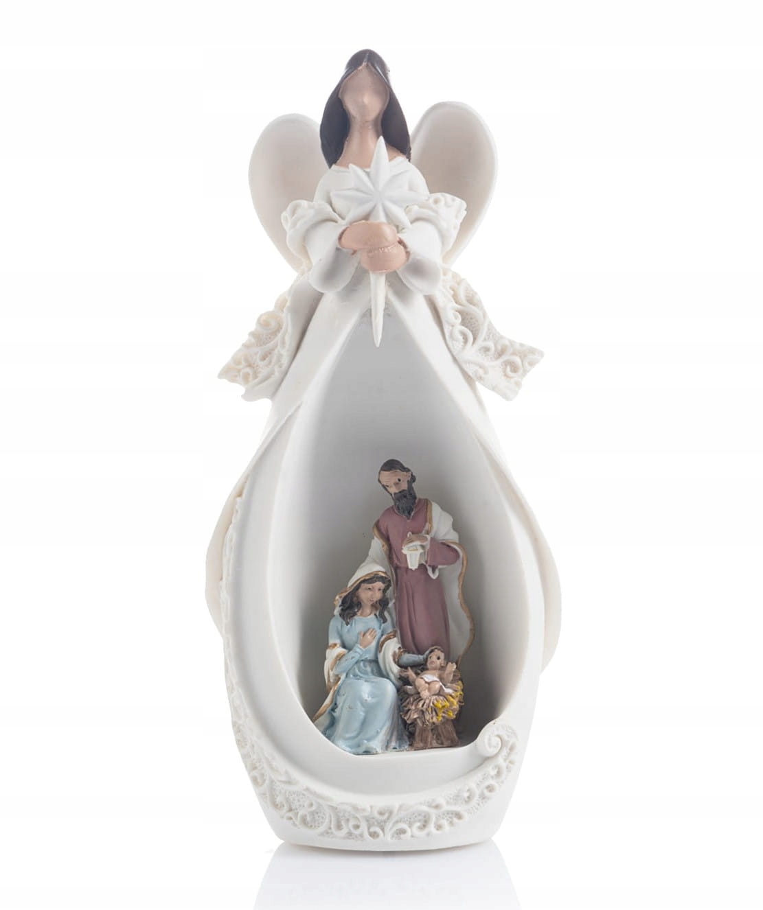 Уникальная рождественская кроватка, изображающая священное семейство, помещенное в фигуру ангела. Фигура символизирует уход за хранителем всего священного семейства.